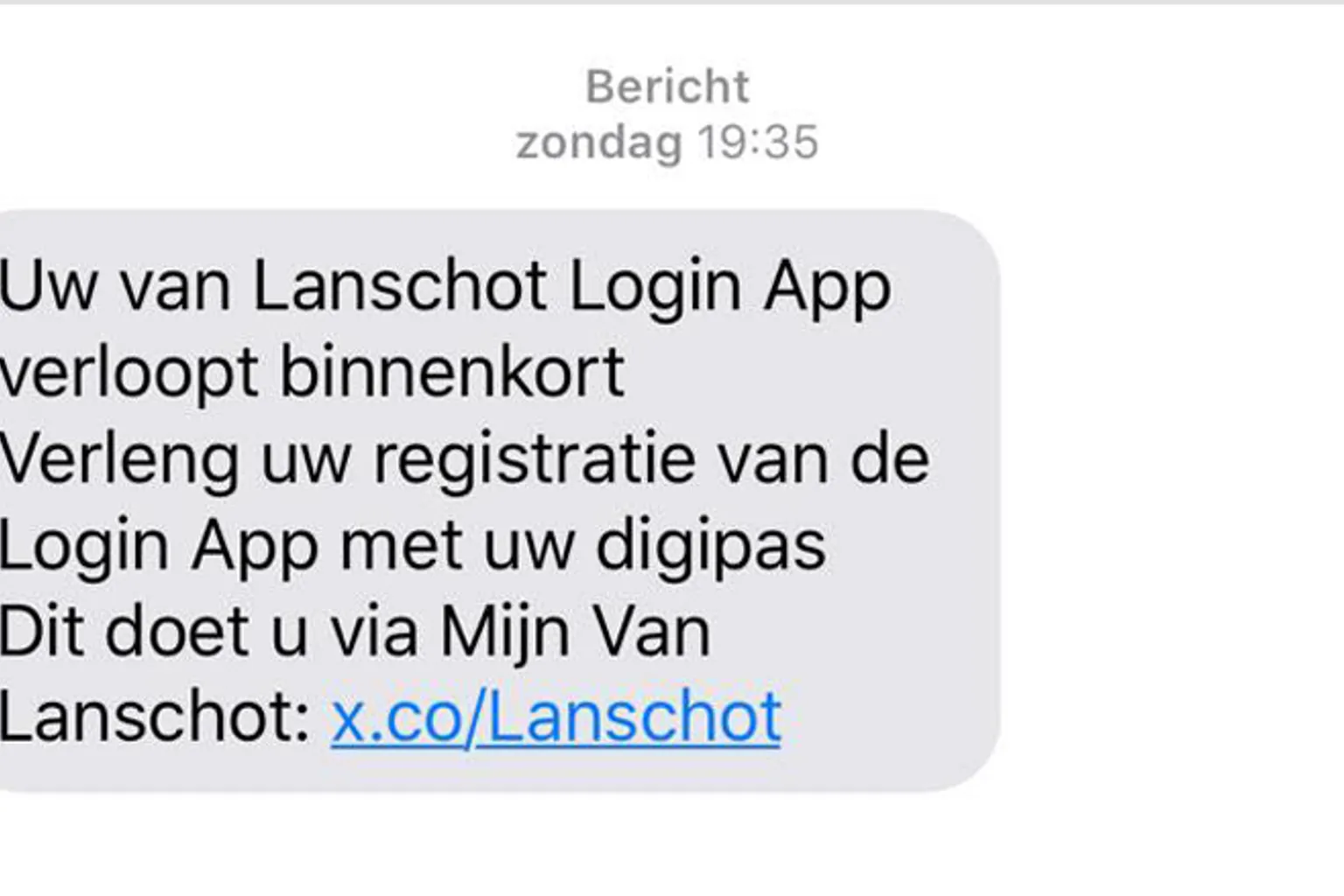 Opgelicht?! kreeg meerdere meldingen over een sms waarin je wordt gevraagd je registratie te verlengen voor de 'log in app' voor Van Lanschot. Doe dit niet. Het is een nep-sms.