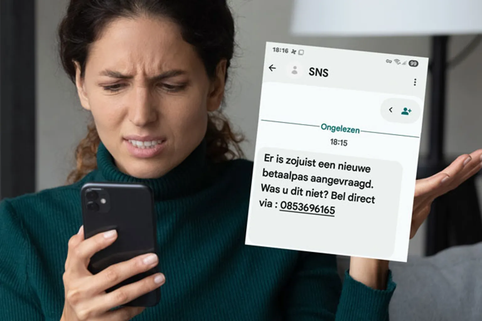 ‘Er is zojuist een nieuwe betaalpas aangevraagd. Was u dit niet? Bel ons dan direct’, sms’en oplichters namens de SNS bank. Trap er niet in, want het bericht is vals.