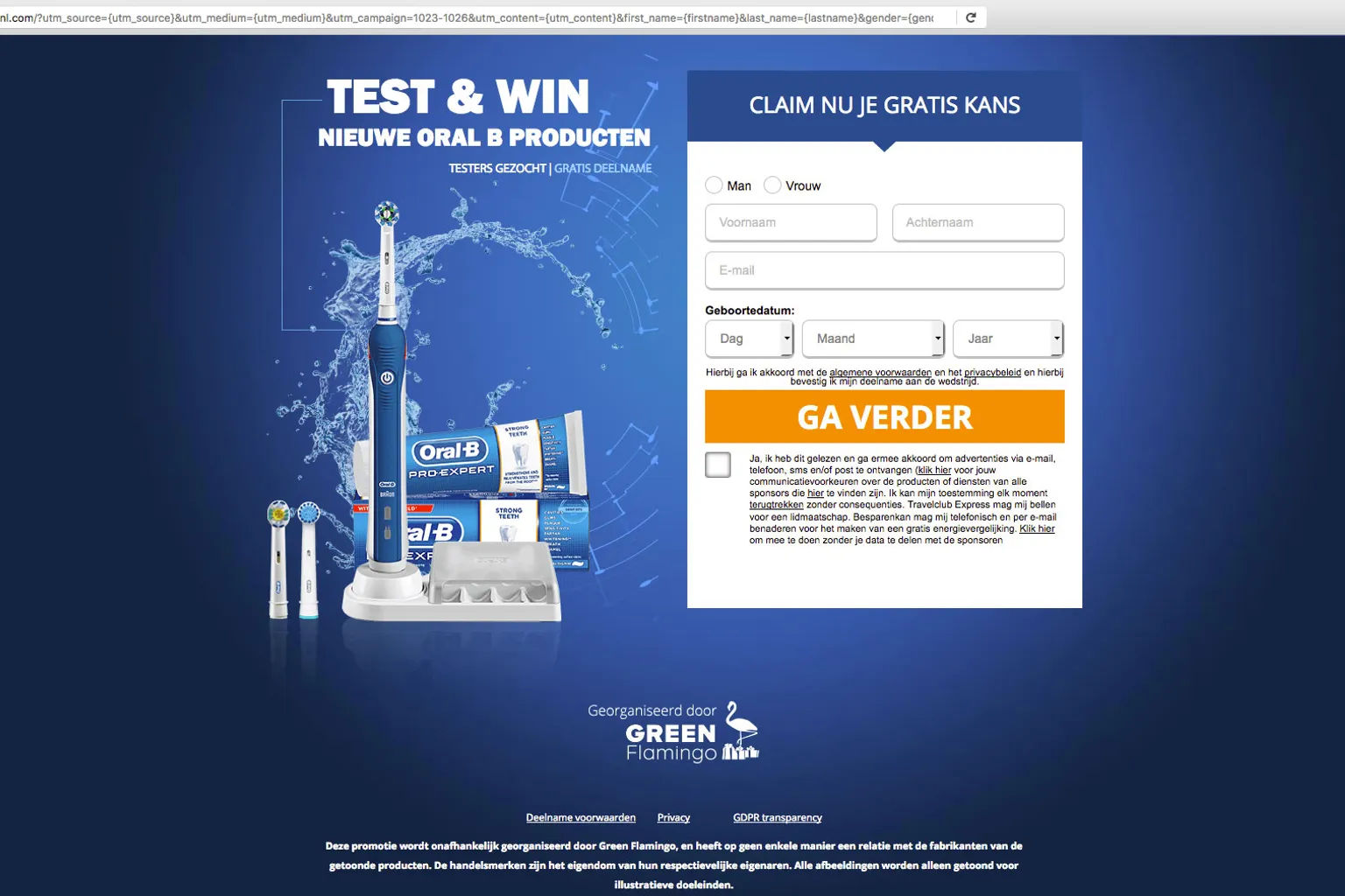 De button verwijst je naar een website waar de eerder benoemde tandenborstel tentoongesteld staat. Daarnaast zijn een aantal vragen zichtbaar die je in moet vullen. Na de vragen ingevuld te hebben wordt er naar je gegevens gevraagd. We adviseren je ten zeerste deze niet te delen. Onderaan de webpagina kun je namelijk lezen dat Oral-B niets met deze winactie te maken heeft. Je kunt de Oral-B Genius 9000 dus niet testen én achteraf mag je het niet houden.