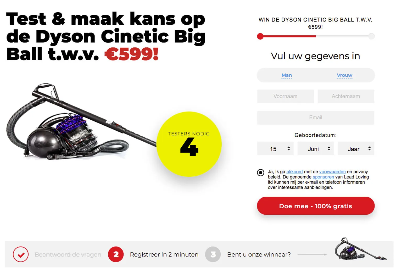 Na het beantwoorden van de vragen dien je je gegevens in te vullen. We raden je ten zeerste af dit te doen. Dit heeft meerdere redenen. Dyson, de aanbieder van de stofzuiger, heeft niets te maken met deze winactie. Je kunt deze stofzuiger niet winnen, ook niet als je je gegevens invult. Daarnaast zal je, als je je gegevens deelt, hoogstwaarschijnlijk lastiggevallen worden met ongewenste telefoontjes en spamberichten.