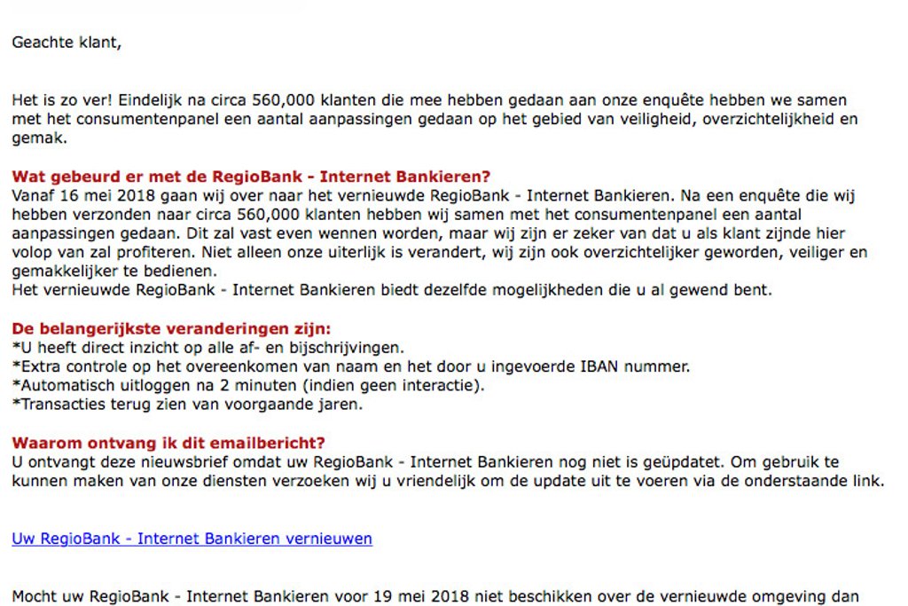 Trap niet in nepmail 'RegioBank' over update internetbankieren