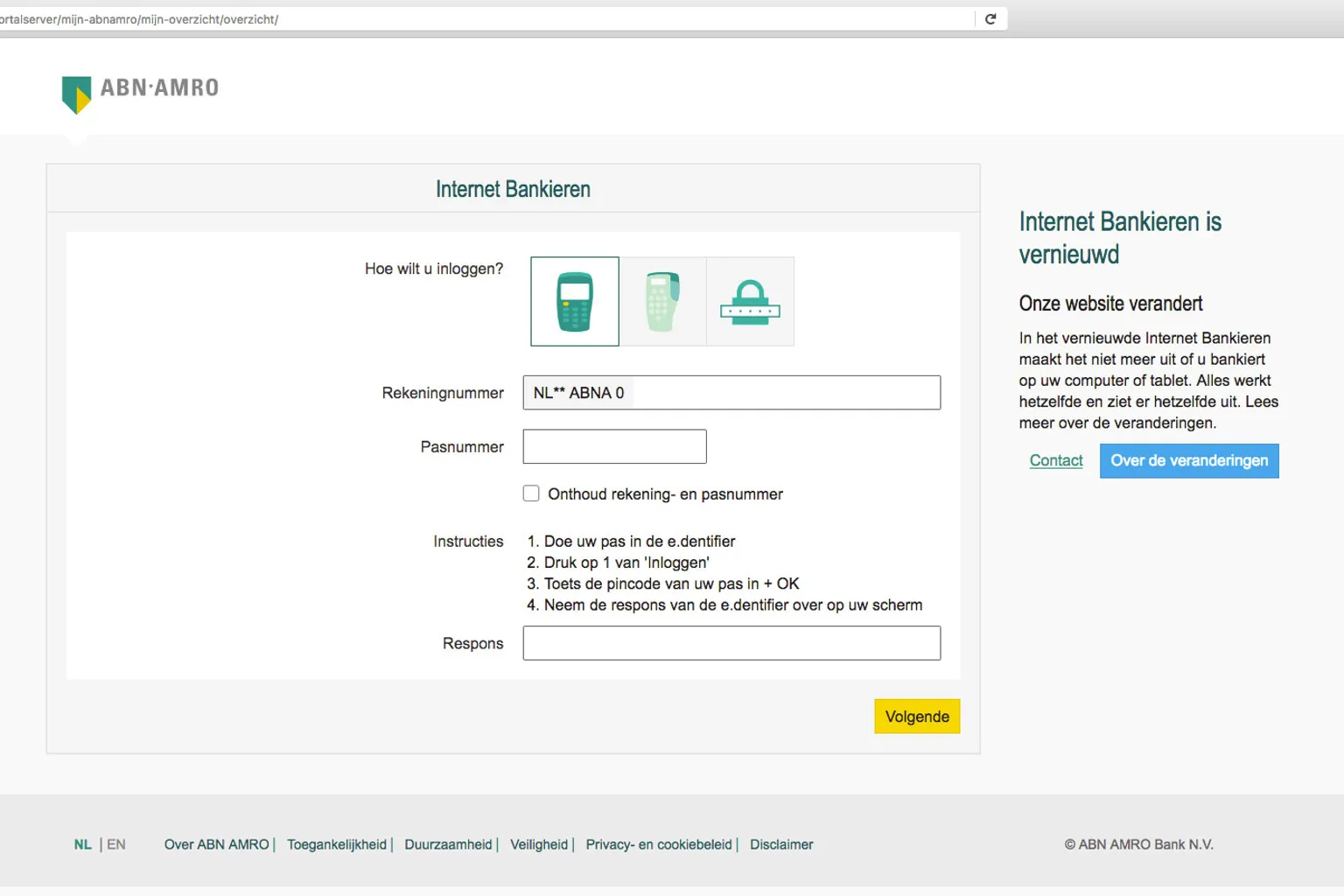 De link verwijst je naar een website die lijkt op de echte pagina van ABN AMRO. Aan de URL (in de adresbalk) kun je echter zien dat het om een valse website gaat. De URL komt namelijk niet overeen met die van de echte ABN AMRO. Daarnaast werken de linkjes op de pagina niet. Dit is dus een phishingsite! Vul je gegevens niet in. Deze zullen in handen van criminelen vallen.