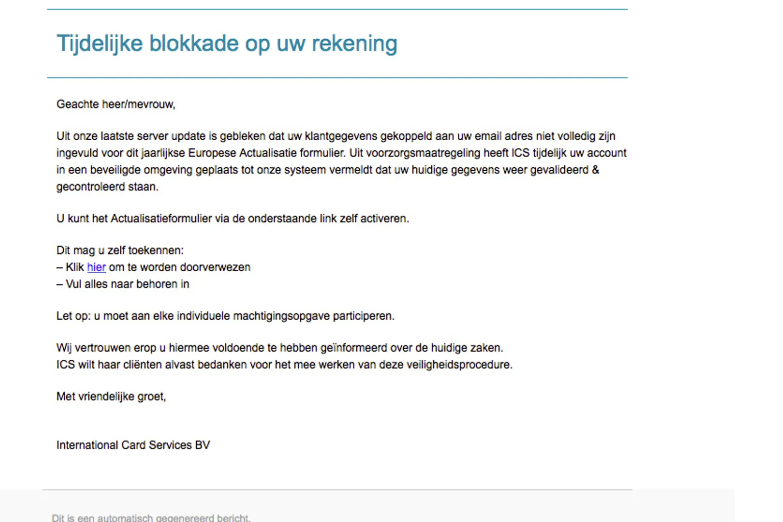 Volgens het bericht is er een server-update geweest waaruit is gebleken dat je klantgegevens niet volledig zijn ingevuld voor het jaarlijkse Europese Actualisatieformulier. Je account is in een beveiligde omgeving geplaatst en je kan je gegevens via de link in het bericht aanvullen. Klik niet!