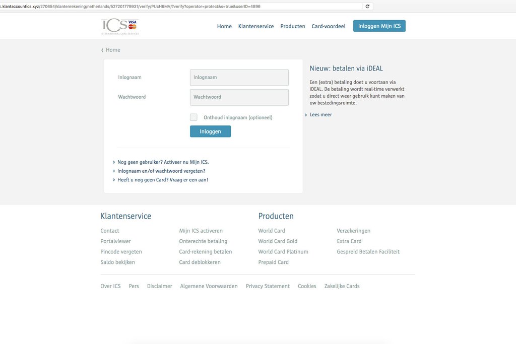 Dit kun je doen door op de button in de e-mail te klikken. Deze verwijst je door naar een website die is opgemaakt in stijl van ICS. Laat je door de opmaak niet misleiden, de echte ICS heeft niets met deze phishingsite te maken. Dit kun je onder andere zien aan de URL (in de adresbalk), deze komt niet overeen met die van de echte ICS.