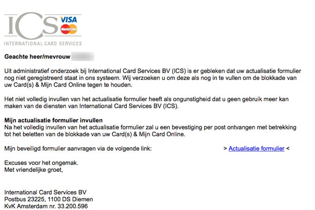 Opgelicht?! krijgt meldingen over een e-mail uit naam van International Card Services (ICS) waarin de ontvanger wordt opgeroepen een 'actualisatie formulier' in te vullen. Hoewel de naam van de ontvanger boven het bericht staat, is ook dit een phishingmail.