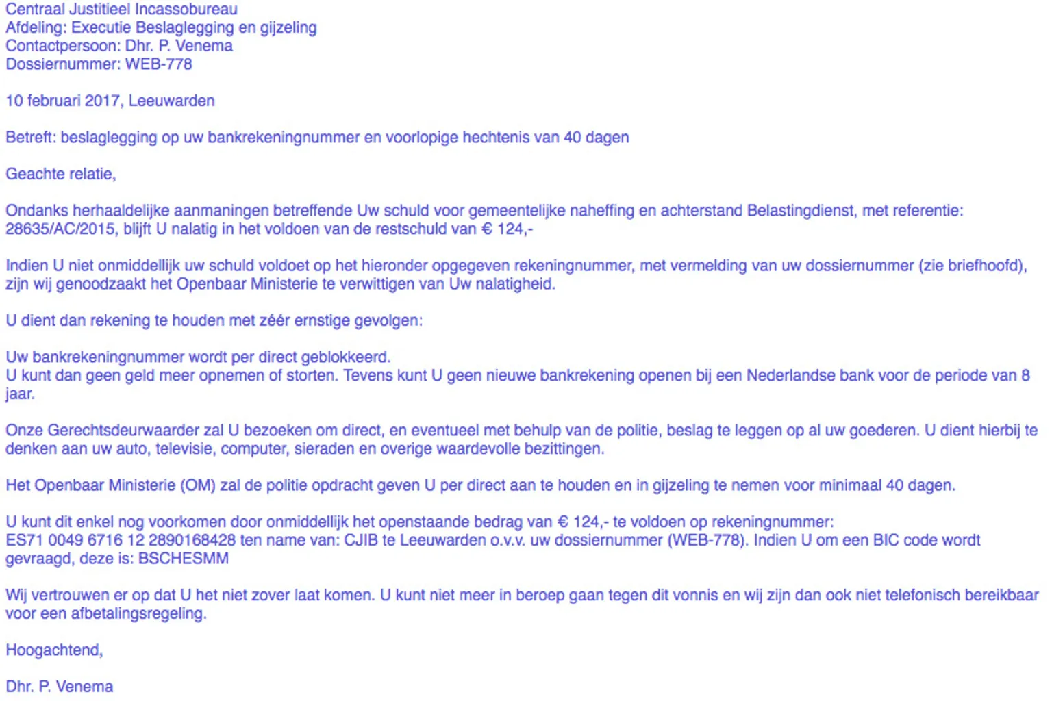 Daarnaast wordt gedreigd met een blokkade van je bankrekening, een gerechtsdeurwaarder die je bezittingen in beslag neemt en de politie die je veertig dagen 'in gijzeling' neemt. Aan het einde van het bericht wordt gesteld dat het 'CJIB' hoopt dat het niet zover komt. Trap hier niet in!