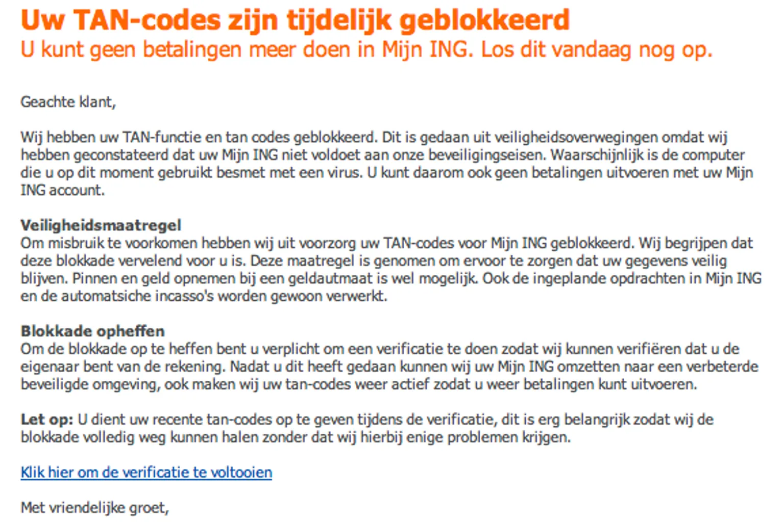 De zender beweert dat je computer is besmet met een virus en daarom jouw Tan-codes en functie uit veiligheidsoverwegingen zijn geblokkeerd. Om dit weer te activeren moet je op een link klikken. Klik hier niet op! Via deze link wordt je doorgestuurd naar een website die speciaal gebouwd is door oplichters om jouw gegevens te stelen.