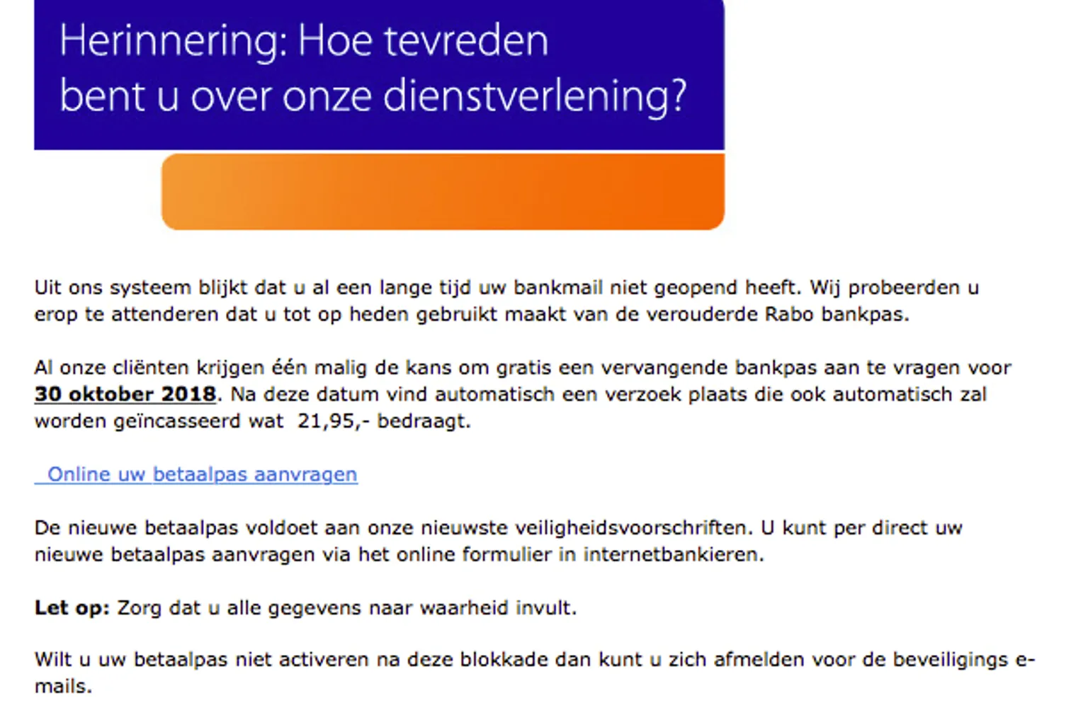Trap niet in valse mail 'Rabobank' over nieuwe bankpas