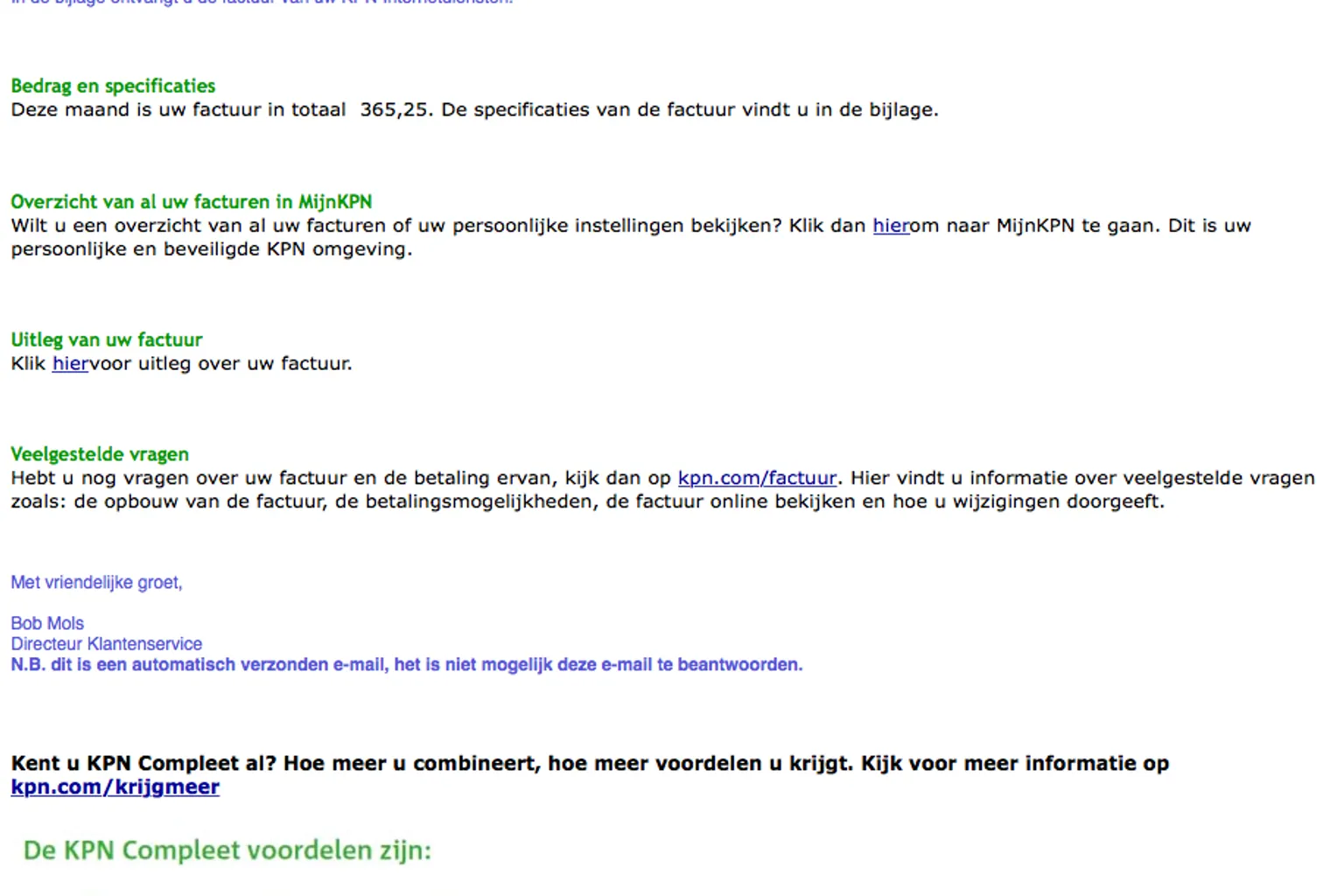Open een bijlage alleen als je de afzender van de e-mail vertrouwt. Bij een echte e-mail van KPN eindigt het e-mailadres altijd op '@kpn.com'. Criminelen worden echter steeds slimmer. Zo kan je zien dat de andere e-mail wel hierop eindigt. Controleer dus ook altijd goed de linkjes! Wanneer je met je cursor op de link gaat staan zonder te klikken, kan je zien naar welke website de link je stuurt. Een link naar een website van KPN begint altijd met 'https://www.kpn.com'.