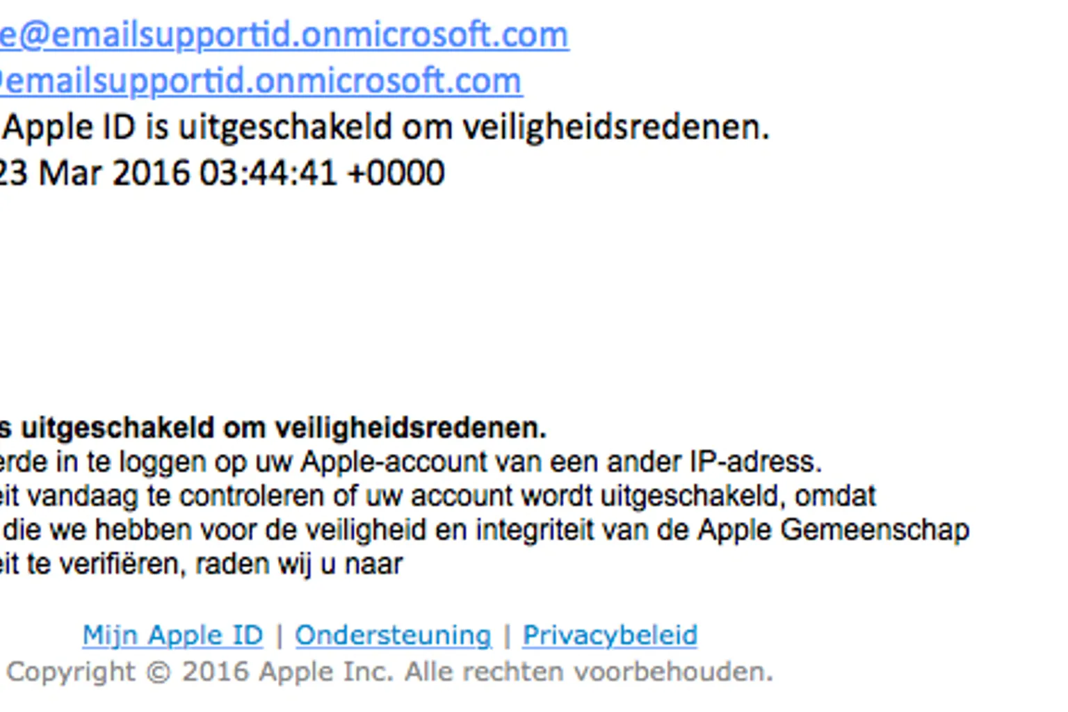 In de valse e-mail staat dat 'Uw Apple ID is uitgeschakeld om veiligheidsredenen'. Je wordt gevraagd om je account te verifiëren. Maar klik niet op de link in de e-mail! Criminelen sturen je naar een nepsite en vragen je om je accountgegevens in te vullen. Trap er niet in!