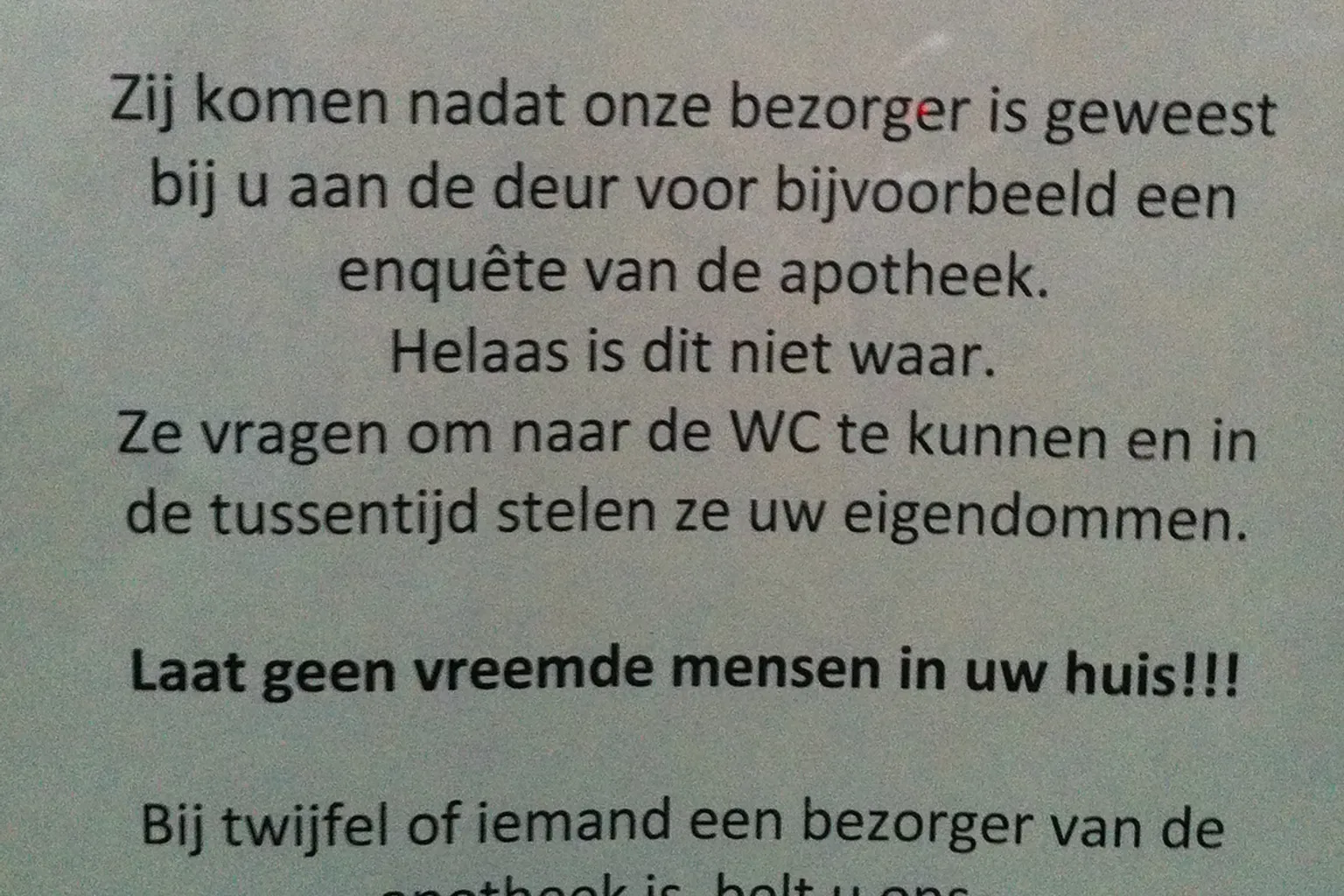 Nadat bonafide apotheekbezorgers langs patiënten zijn geweest, wordt er door een tweede bezorger aangeklopt. Deze wil een enquête voor de apotheek afnemen. Laat deze bezorger niet binnen! Het gaat hier om een babbeltruc. De oplichter probeert met een smoes binnen te komen om zo je waardevolle spullen te stelen.