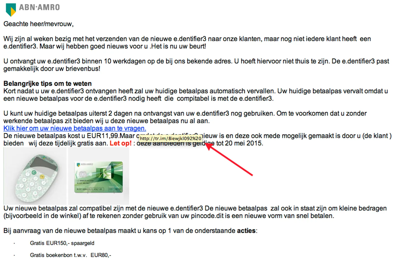 Opgelicht?! krijgt veel meldingen over een valse e-mail, zogenaamd van ABN AMRO. In de mail valt te lezen dat je voor 20 mei gratis een nieuwe betaalpas kunt aanvragen, die 'compitabel is met de nieuwe e.dentifier3'. Ga hier niet op in!
