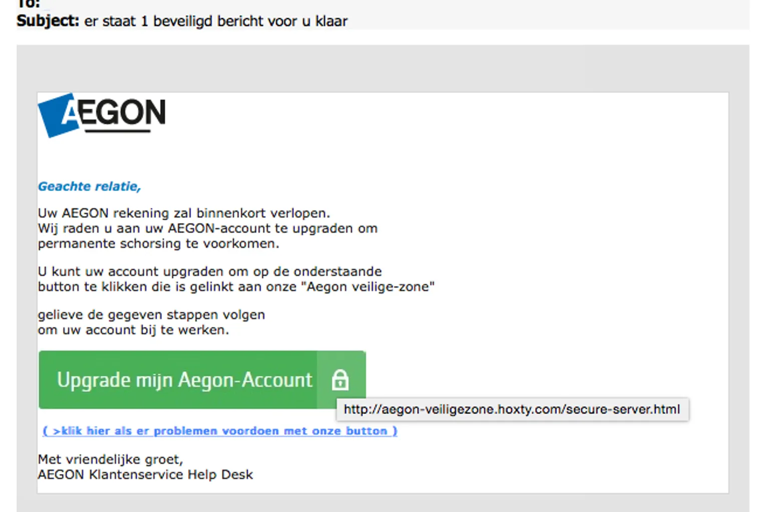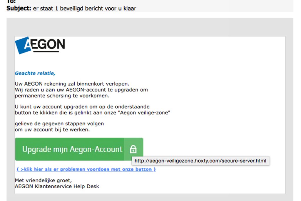 Volgens de mail is de online rekening geblokkeerd en heeft 'Aegon' benodigde informatie nodig om de rekening te actualiseren.