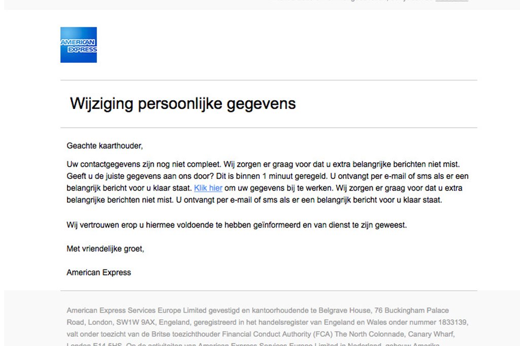 Volgens de e-mail zouden je contactgegevens nog niet compleet zijn, waardoor je belangrijke berichten mist. Je wordt gevraagd te klikken op een link om je gegevens bij te werken. Deze link verwijst echter niet naar de website van American Express, maar naar een nagemaakte pagina. Alles wat je daar invult, valt in handen van criminelen, met alle gevolgen van dien.