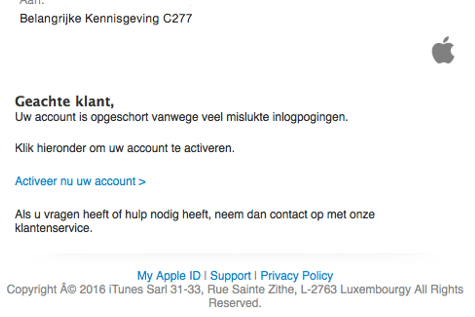 Dit zou zijn gebeurd vanwege 'veel mislukte inlogpogingen'. In de e-mail staat een link waar je je account zogenaamd kunt activeren. Trap er niet in! Je komt terecht op een valse website, criminelen proberen op deze manier achter je gegevens te komen.