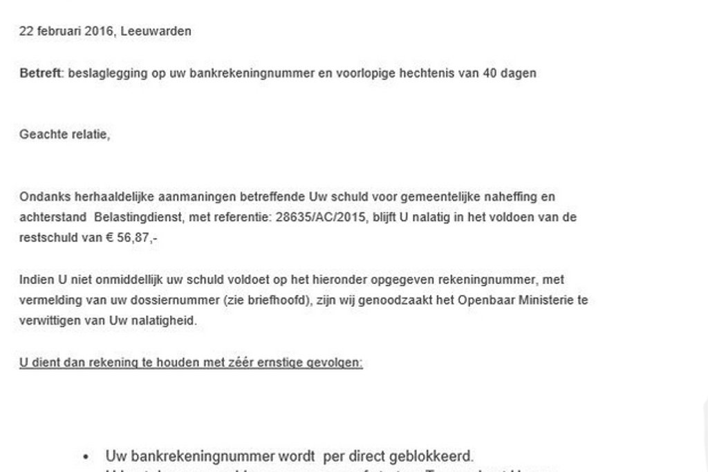 Volgens het bericht moet een bedrag van € 56,87 onmiddellijk worden overgemaakt. Gebeurt dit niet, dan wordt je bankrekening geblokkeerd, zal een deurwaarder beslag komen leggen op je spullen en krijgt de politie opdracht je voor minimaal 40 dagen in gijzeling te nemen. Ook deze e-mail is verstuurd door oplichters. Het geld moet worden overgemaakt naar een Spaans rekeningnummer.