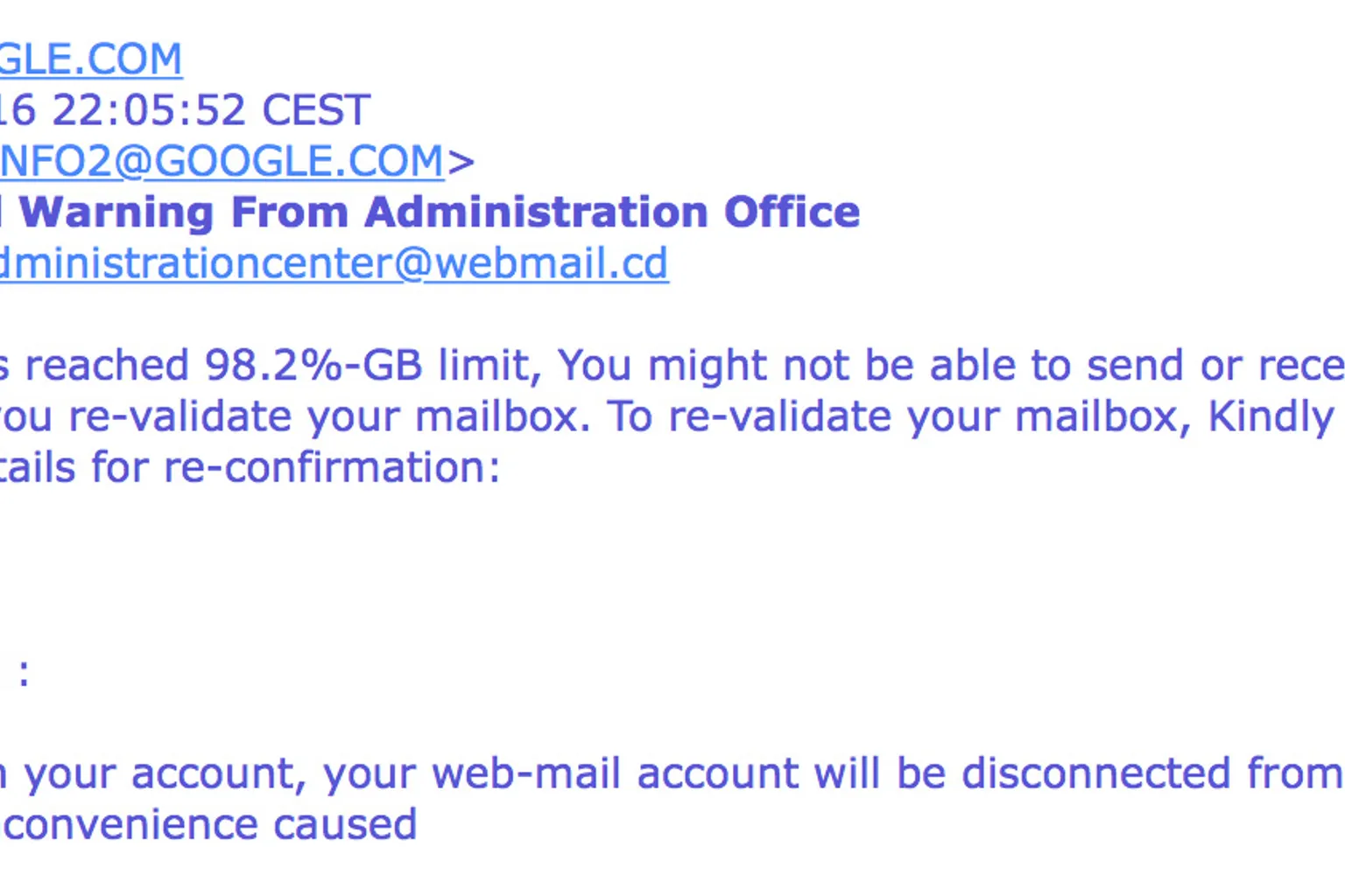 Volgens de Engelstalige e-mail zou de limiet van je mailquota bijna bereikt zijn. Daarom wordt je gevraagd je e-mailadres te bevestigen door een mailtje terug te sturen met daarin je login en wachtwoord. Ga hier niet op in en gooi het dit soort e-mails direct weg!