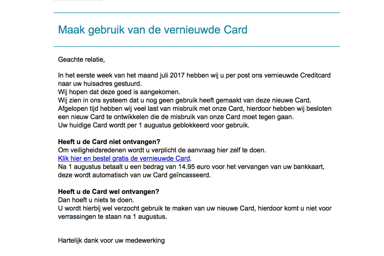 Als je de afzender van de e-mail moet geloven, is begin deze maand een nieuwe creditcard naar je huisadres gestuurd. Wie de kaart niet heeft ontvangen, is verplicht zelf een nieuwe kaart aan te vragen voor 1 augustus. Daarna zou een bedrag van € 14,95 worden berekend.