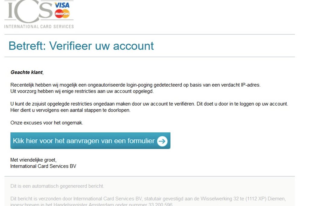 In een phishingmail van 'ICS' staat dat er 'restricties' aan je account zijn opgelegd door een ongeautoriseerde poging tot inloggen. Om de restricties ongedaan te maken, dien je de gegevens op je account opnieuw in te vullen.