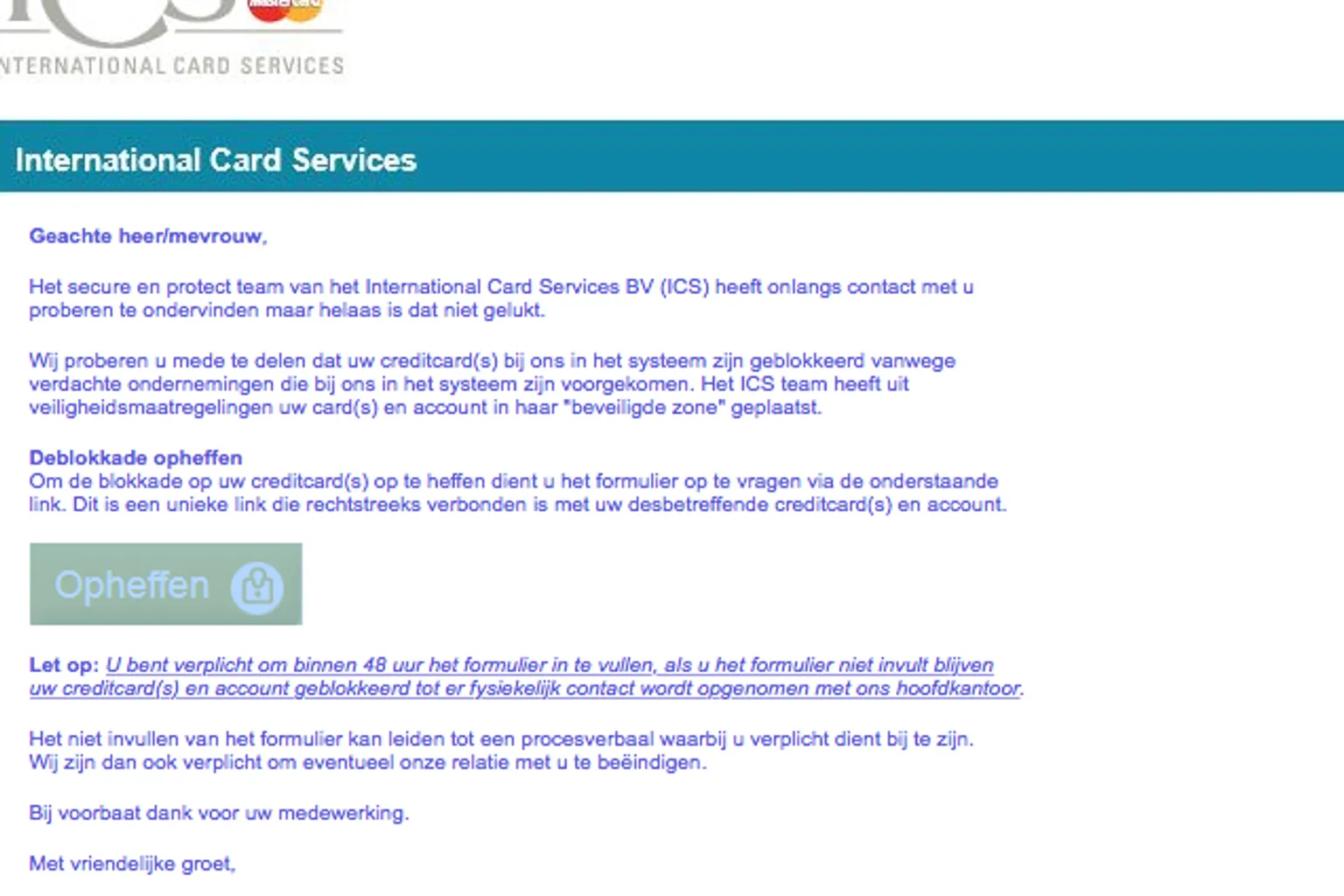 Volgens de afzender heeft het team van ICS geprobeerd contact met je op te nemen, maar is dit niet gelukt. Vanwege 'verdachte ondernemingen die in het systeem zijn voorgekomen' zou je creditcard zijn geblokkeerd. Om de blokkade op te heffen dien je op een link te klikken en een formulier in te vullen.