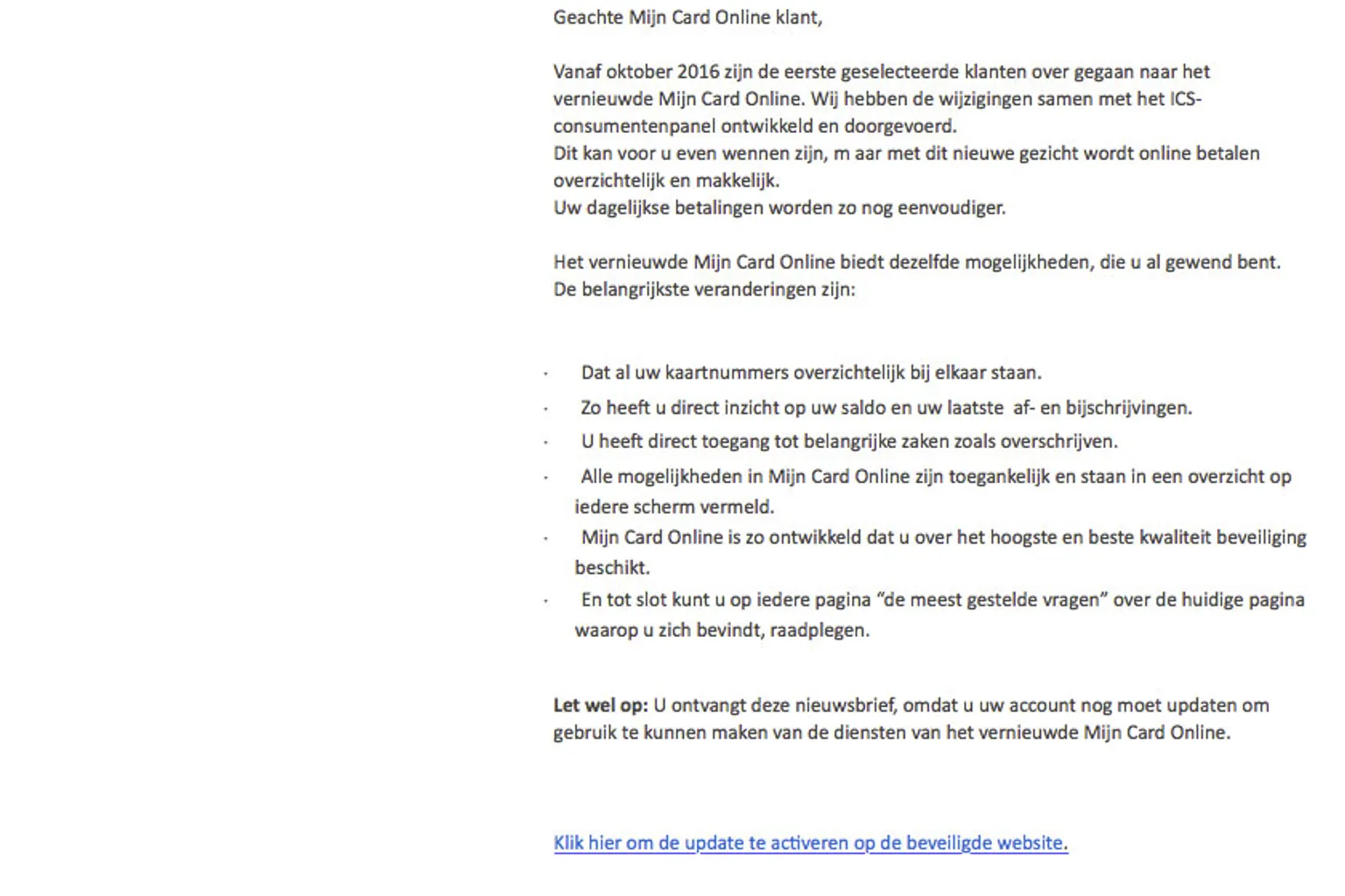 Volgens het bericht moet je jouw account nog updaten. Je zou door deze update gebruik kunnen maken van verschillende veranderingen. 'Met de vernieuwde online omgeving van ICS wordt online betalen overzichtelijk en makkelijk', zo schrijven criminelen.