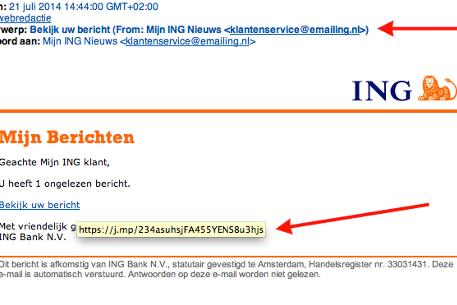 De link in de e-mail verwijst naar een andere website dan die van de ING. Dit kunt u zien door met de cursor van uw muis op de link te gaan staan, zonder deze aan te klikken. U ziet dan dat de link niet eindigt op 'ing.nl'. Ook eindigt het afzender e-mailadres niet op 'ing.nl'.