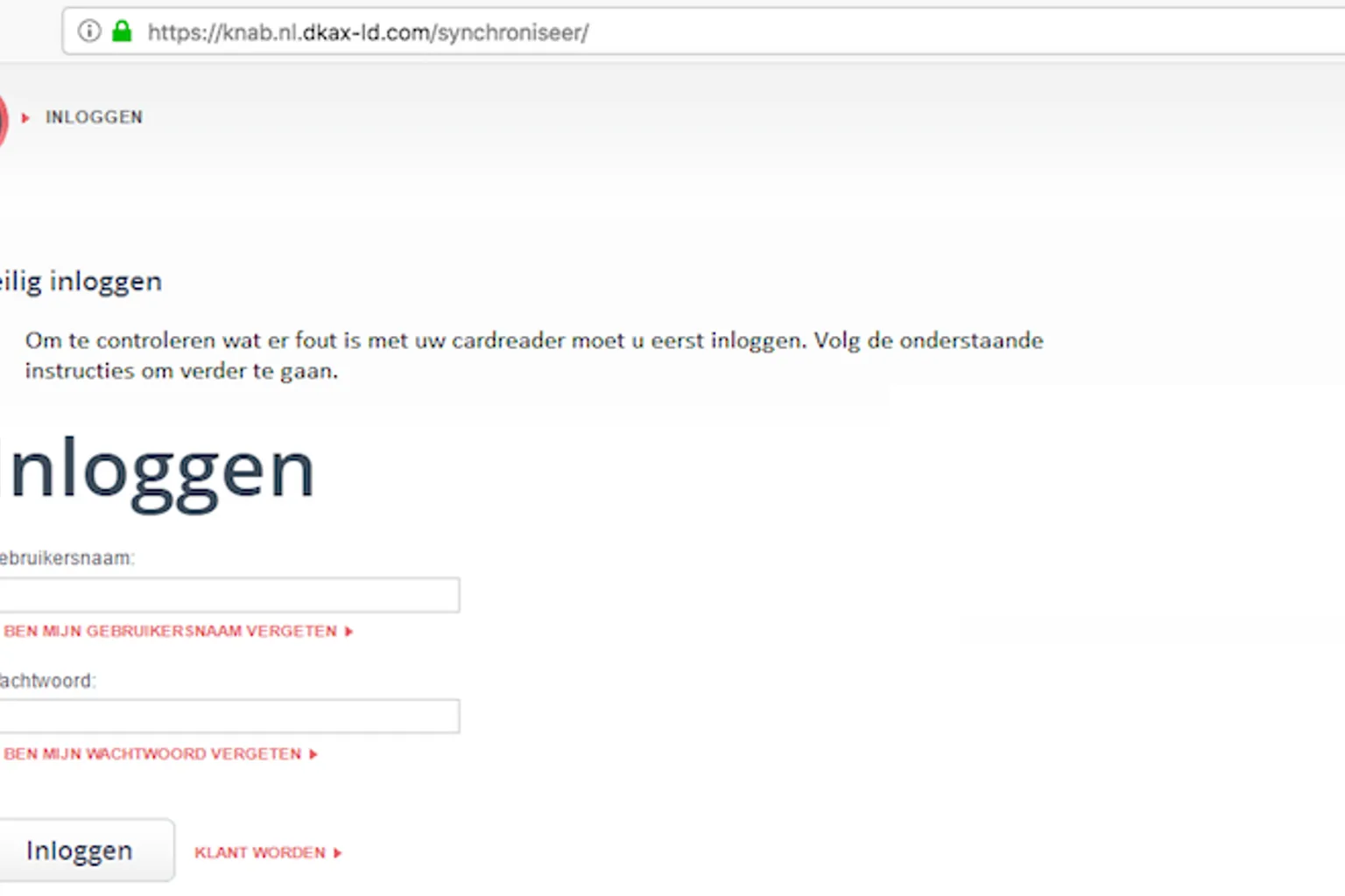Je cardreader zendt signalen uit die zorgen voor een lichte storing in het systeem van de bank, is dit keer het excuus. Om die reden wordt je cardreader binnen enkele dagen onklaar gemaakt en moet je een vervangend exemplaar aanvragen. De link in het mailtje leidt je naar een inlogportaal op het domein knab.nl.dkax-ld.com/synchroniseer/, maar dit is uiteraard geen website van de bank. Log je toch in? Dan stuur je criminelen je inloggegevens door en kun je er rustig van uitgaan dat ze binnen de kortste keren aan de haal gaan met je banksaldo.