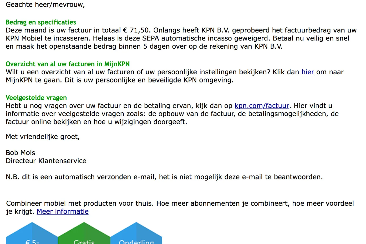 Volgens de e-mail heeft het telecombedrijf geprobeerd € 71,50 van je rekening te incasseren. Dit is niet gelukt doordat de incasso geweigerd werd. Je wordt verzocht het bedrag binnen vijf dagen over te maken. Doe dit niet!