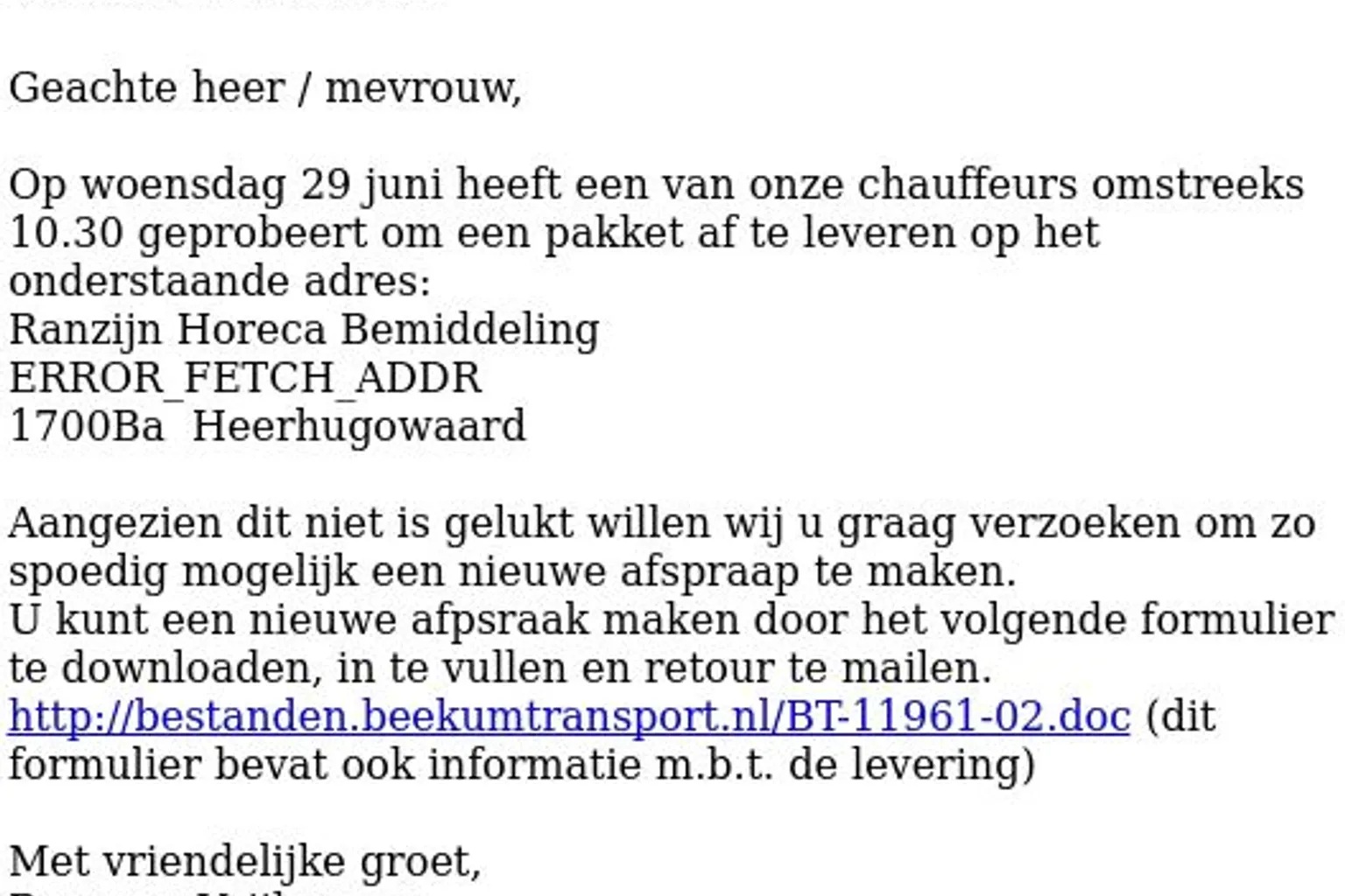 Het bericht is tenminste met twee verschillende namen als afzender verstuurd. Zowel de naam 'Beekum Transport' als 'Hoffman Transport' wordt gebruikt.