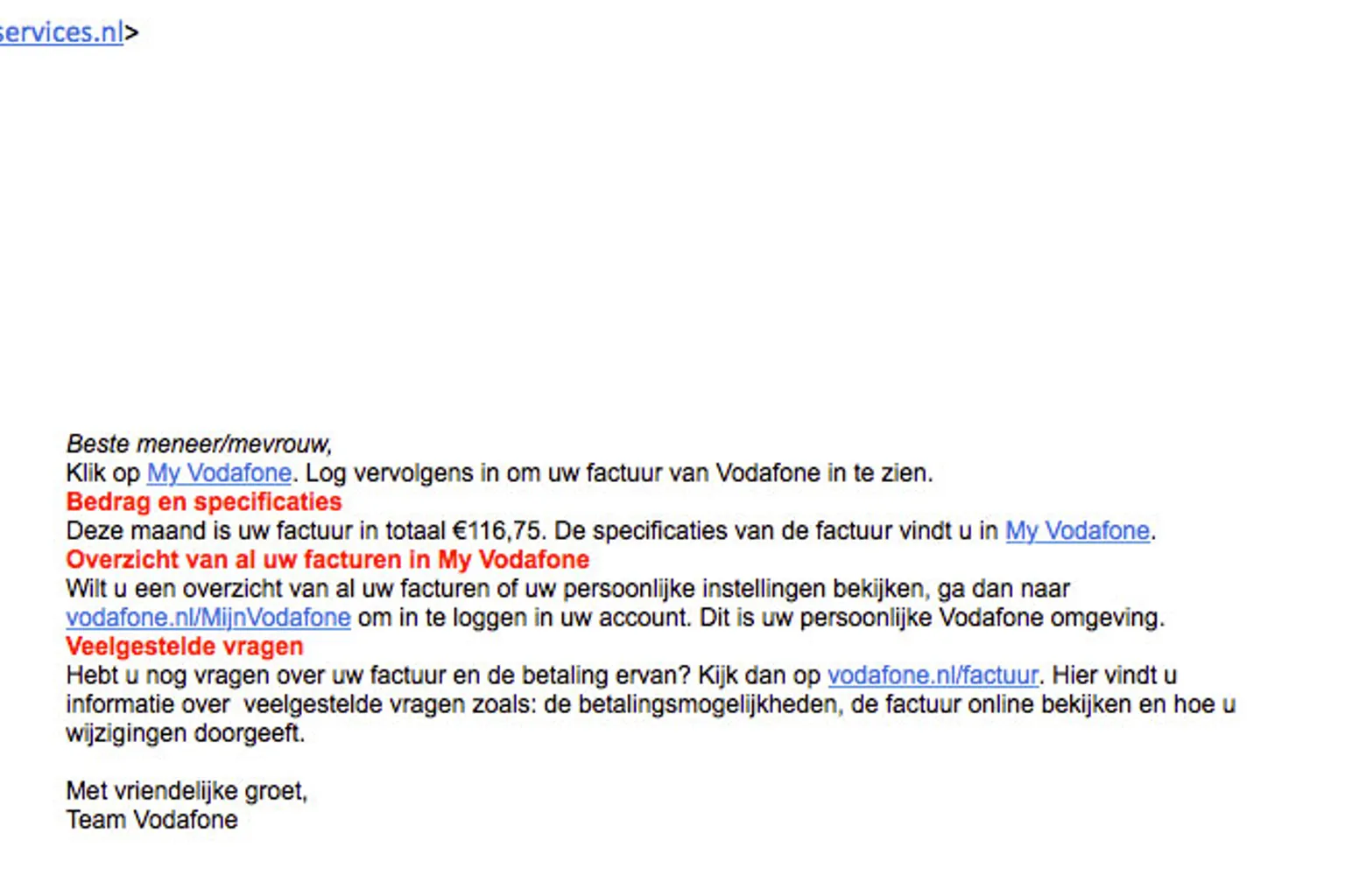 Criminelen versturen een e-mail uit naam van Vodafone waarin staat dat je een factuur moet betalen. Trap hier niet in. Het telecombedrijf heeft hier niets mee te maken.