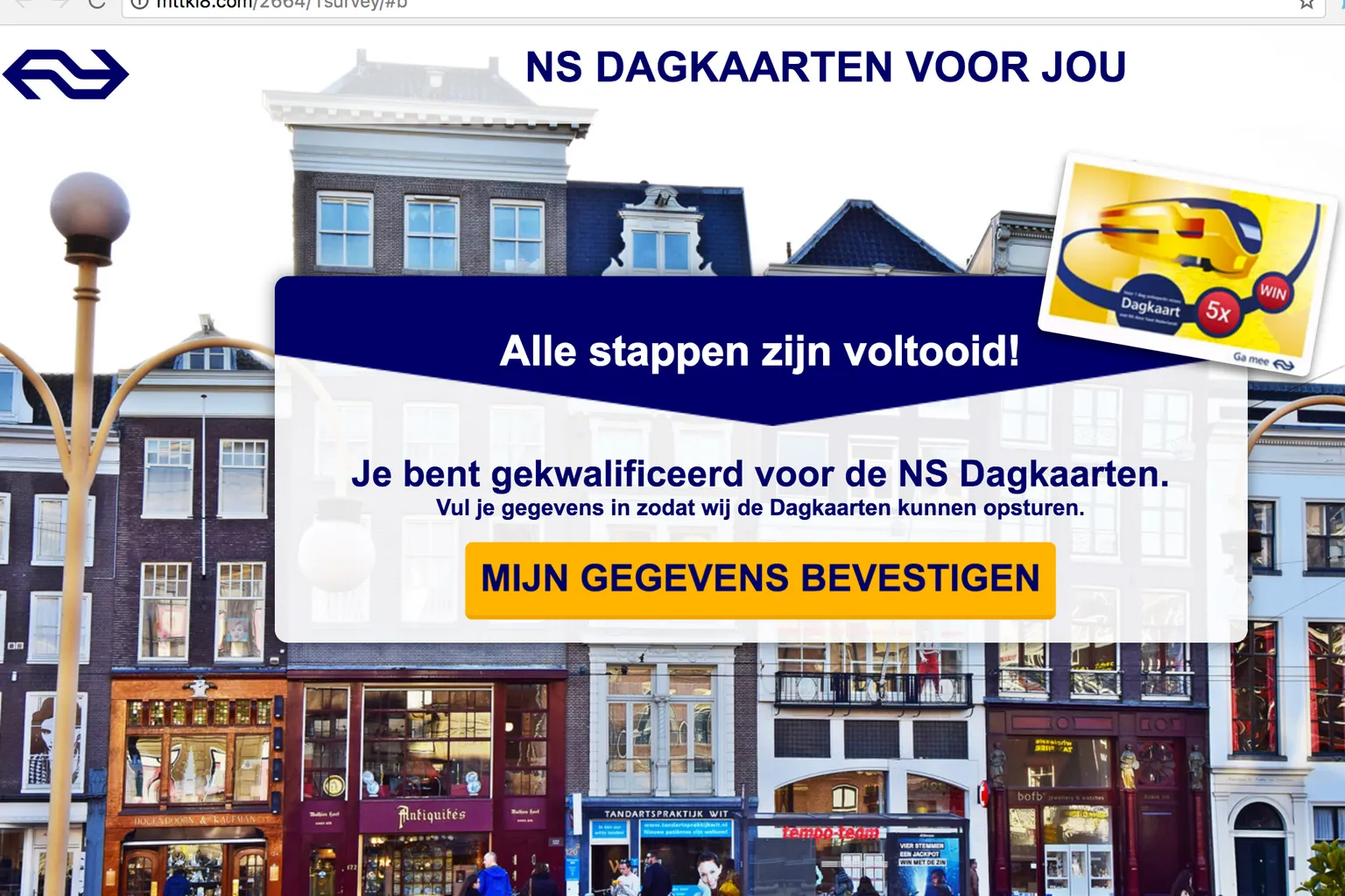 Klik je op de link om de dagkaarten te claimen, dan kom je terecht op een pagina waarop het logo van NS te zien is. Deze site is echter niet van NS. Dit kun je zien aan de url. Je krijgt een aantal vragen voorgeschoteld en vervolgens wordt om je gegevens gevraagd. Ga hier niet op in! Fraudeurs kunnen misbruik maken van deze gegevens. Je kunt bijvoorbeeld in plaats van de dagkaarten een hoop spam verwachten.