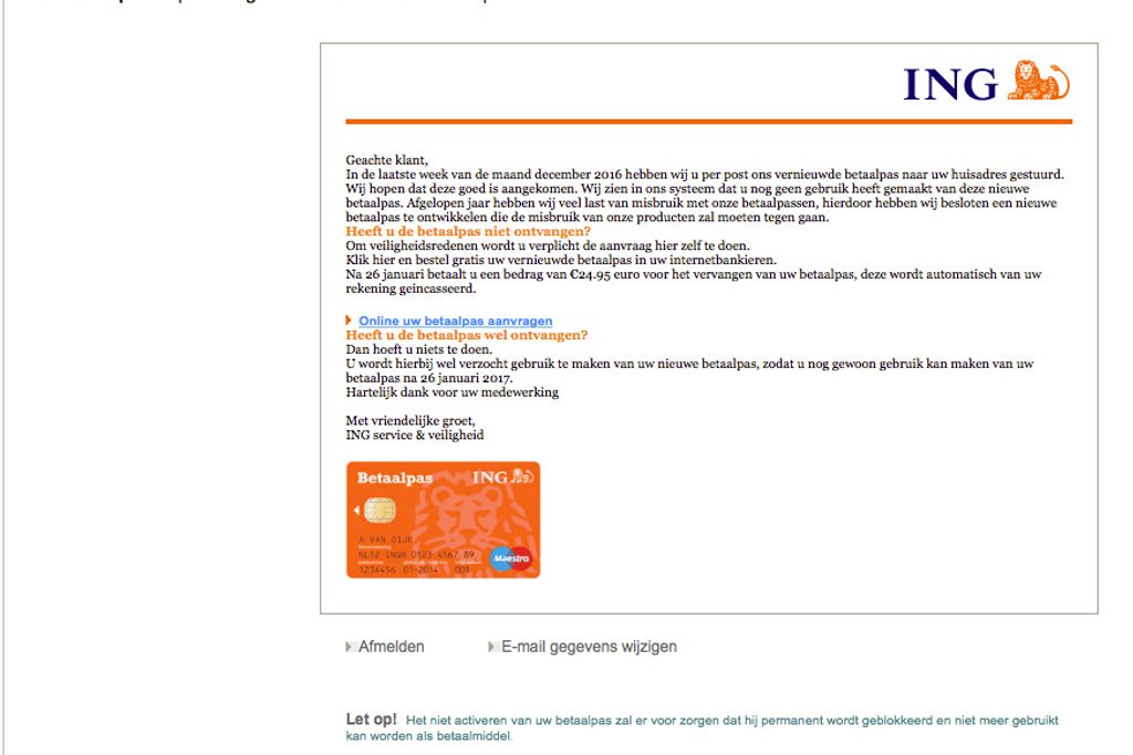 Wederom gaat een e-mail rond namens 'ING'. Hierin wordt beweerd dat een nieuwe betaalpas is opgestuurd. In de mail zit een link, waar men gegevens dient in te vullen. Doe dit niet!