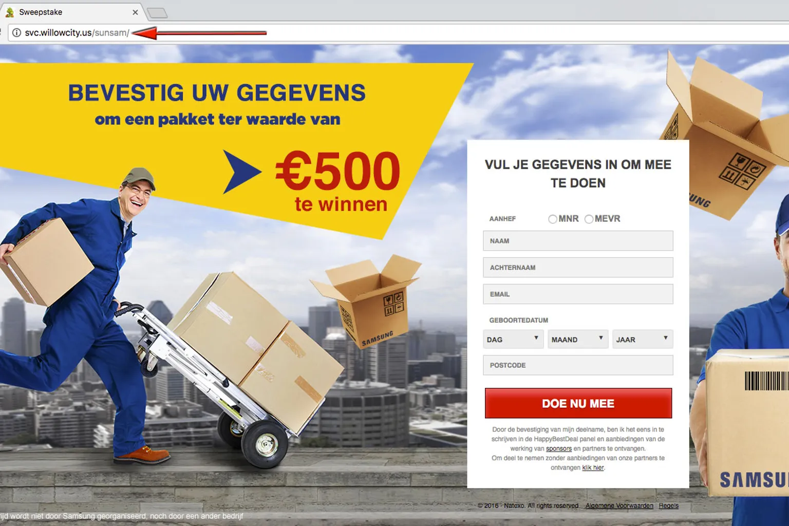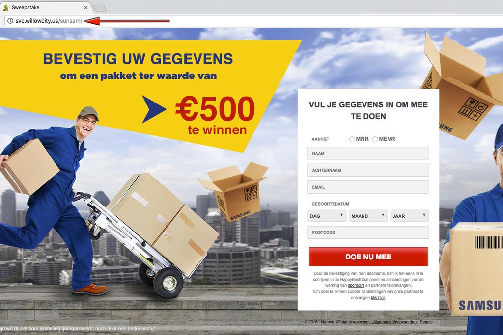 Op de beginpagina van de website staat in het klein geschreven: 'Deze wedstrijd wordt niet door Samsung georganiseerd, noch door een ander bedrijf.' Ook staat hier dat je bij deelname akkoord gaat met dat je wordt ingeschreven voor de 'HappyBestDeal panel'. Daarnaast ontvang je aanbiedingen van sponsors. In de algemene voorwaarden valt te lezen dat de ingevulde gegevens onder andere beschikbaar worden gesteld voor commerciële doeleinden.