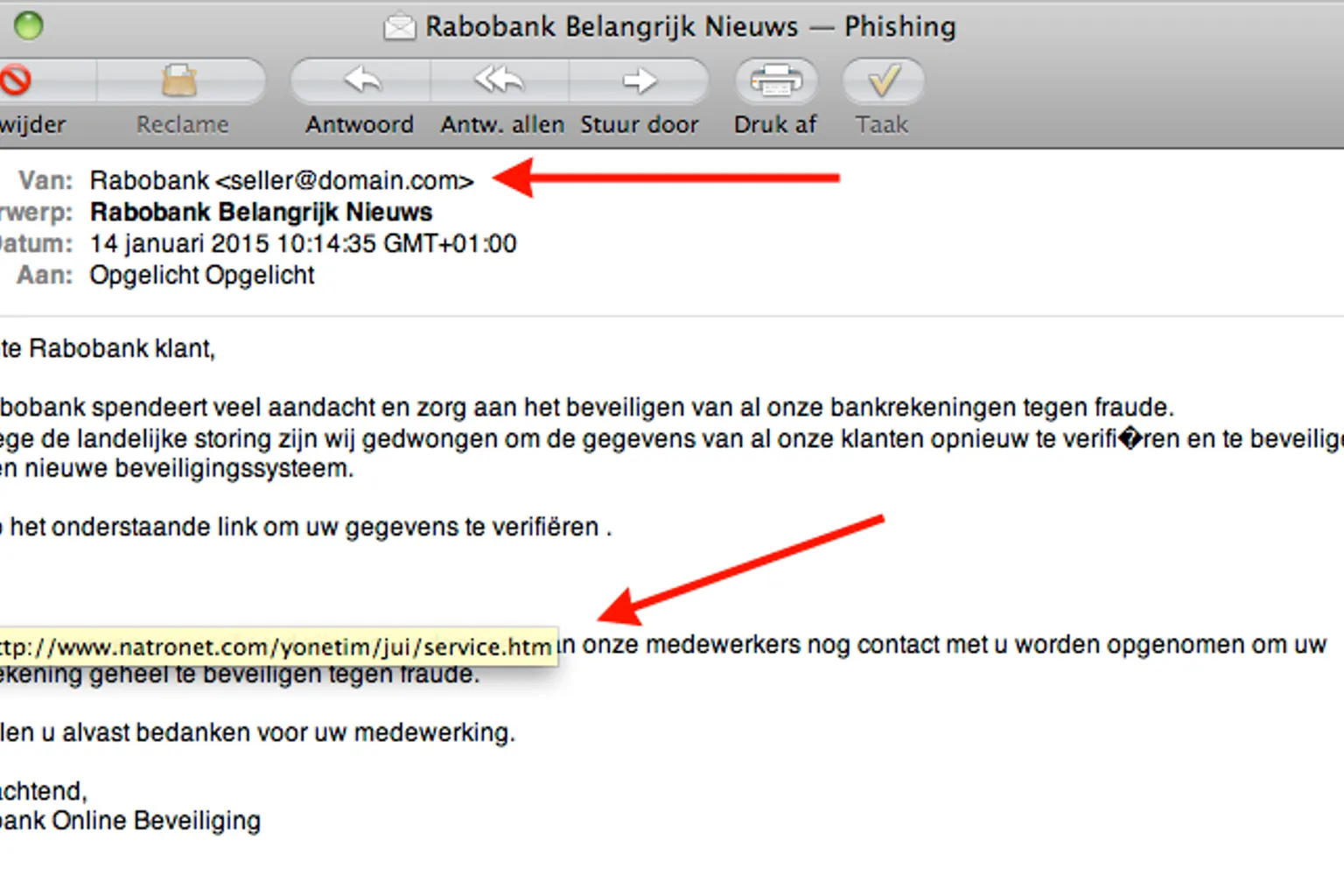 De link in de e-mail verwijst naar een andere website dan die van de Rabobank. Dit kunt u zien door met de cursor van uw muis op de link te gaan staan, zonder deze aan te klikken. U ziet dan dat de link niet eindigt op 'rabobank.nl'. Ook lijkt het afzender e-mailadres niet eens op een mailadres van de Rabobank.