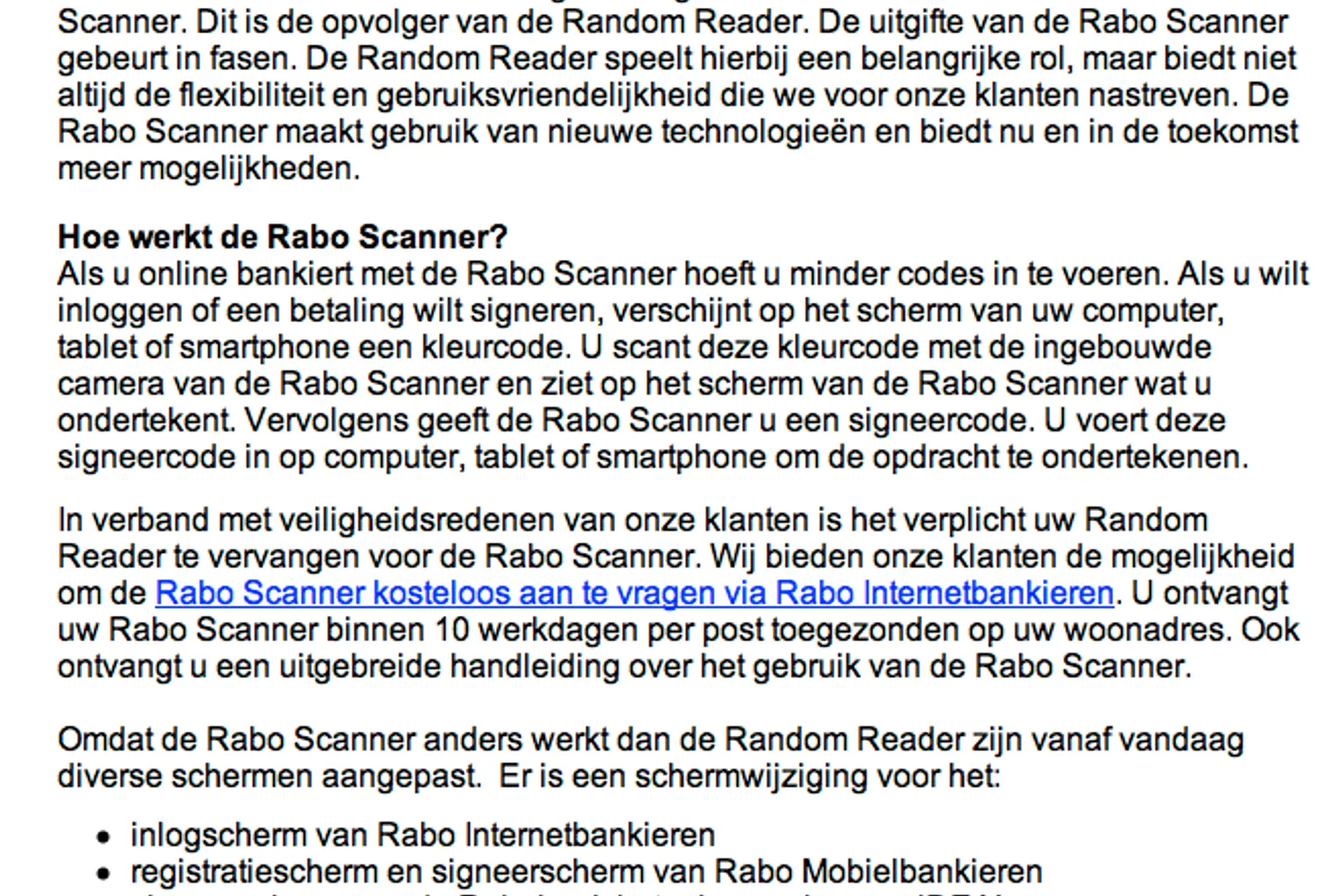 In de mail valt te lezen dat het verplicht is de Random Reader te vervangen door de Rabo Scanner. Via de link zou je de scanner kunnen aanvragen. Dit is echter een slinkse truc van oplichters om jouw persoons- en bankgegevens in handen te krijgen.