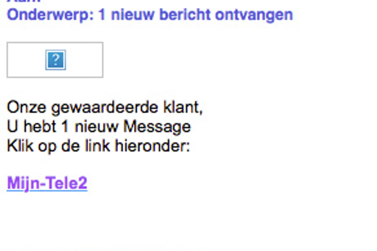 Uit naam van Tele2 wordt een e-mail verstuurd waarin staat dat je een nieuw bericht hebt. Ga hier niet op in!