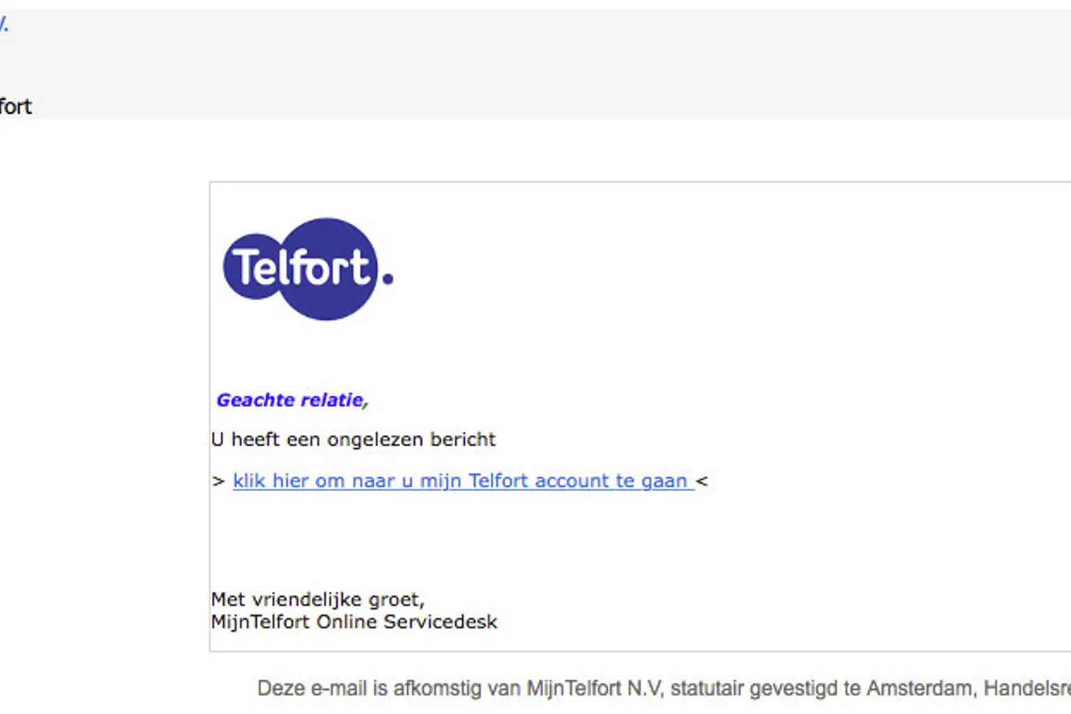 Een e-mail ontvangen uit naam van Telfort waarin staat dat je een ongelezen bericht hebt? Laat je niet misleiden.