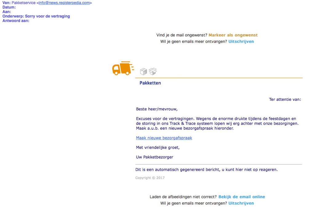 Volgens de e-mail moet je op een link klikken om een nieuwe bezorgafspraak te maken, omdat het postbedrijf erg achterloopt met het bezorgen van pakketjes. Dit wegens drukte en een storing in het Track & Trace systeem.