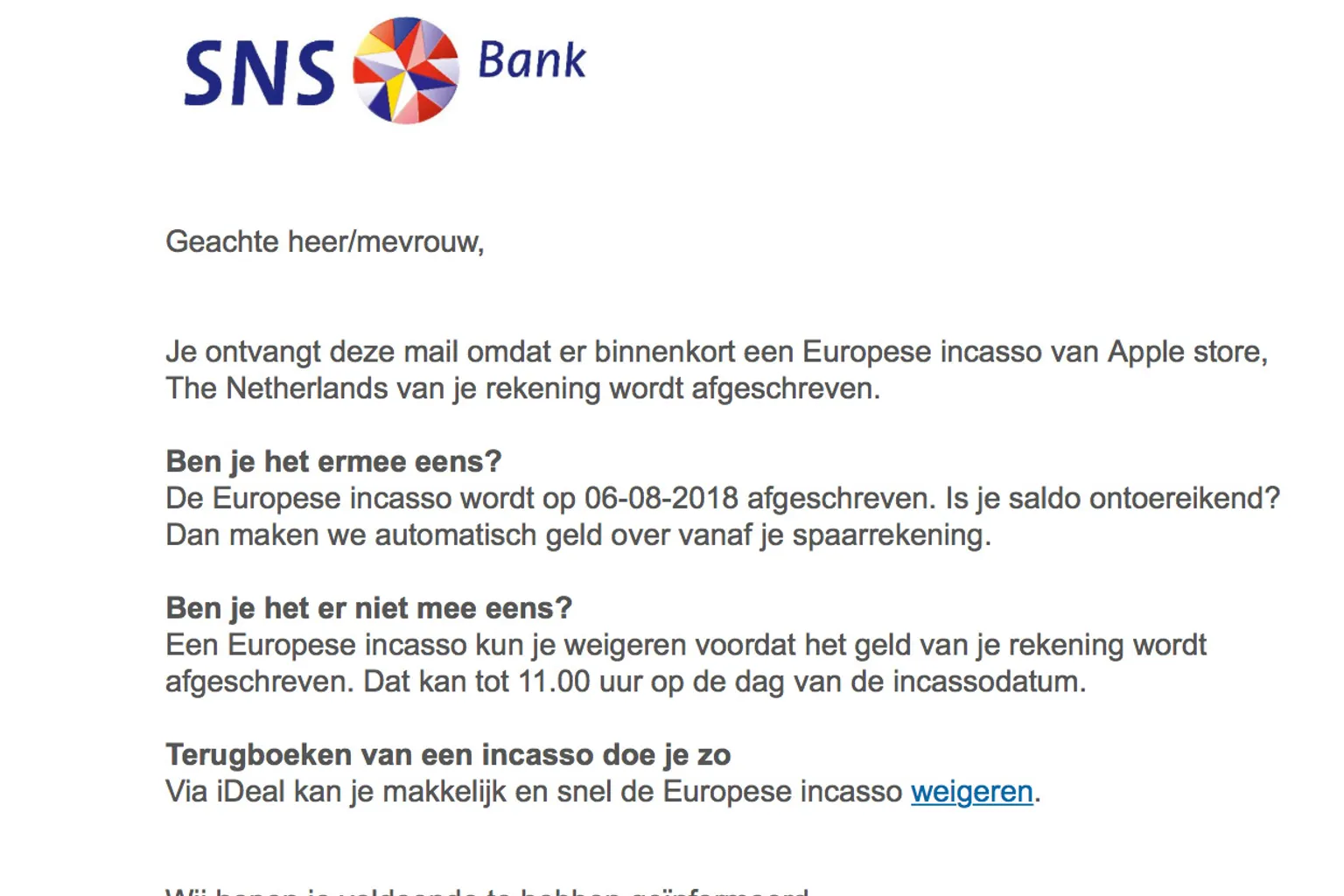 Momenteel gaat een e-mail rond, zogenaamd van SNS Bank, waarin staat dat er binnenkort een Europese incasso van Apple store wordt afgeschreven. Als je het hier niet mee eens bent, kun je de incasso zogenaamd weigeren via iDeal.