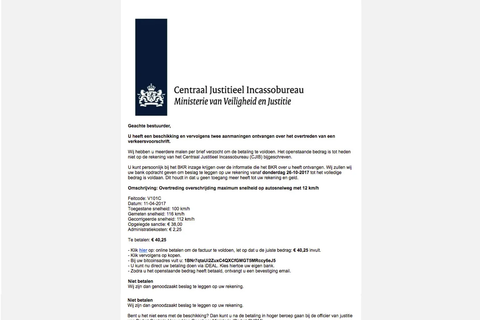 Je moet het openstaande bedrag volgens het bericht betalen in bitcoins. Hieruit blijkt duidelijk dat het een valse mail betreft: het 'echte' CJIB vraagt personen nooit om op deze manier te betalen. Criminelen proberen je hiermee geld afhandig te maken zonder dat ze te traceren zijn. Trap er niet in en verwijder het bericht direct.
