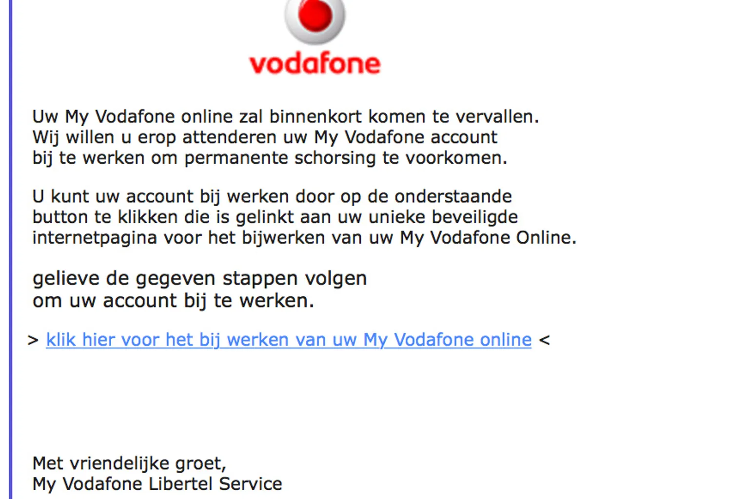 In een bericht van 'Vodafone' staat dat je My Vodafone account binnenkort komt te vervallen. Om dit te voorkomen, dien je jouw gegevens te verifiëren. Doe dit niet!