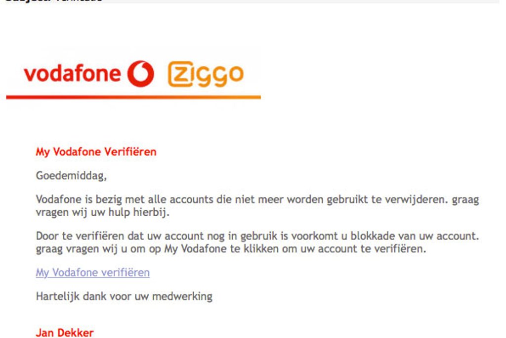 Heb je een mail ontvangen waarin 'Vodafone' je vraagt je account te verifiëren, let dan goed op! Fraudeurs sturen valse e-mails namens het telecombedrijf waarmee ze je gegevens proberen te bemachtigen.