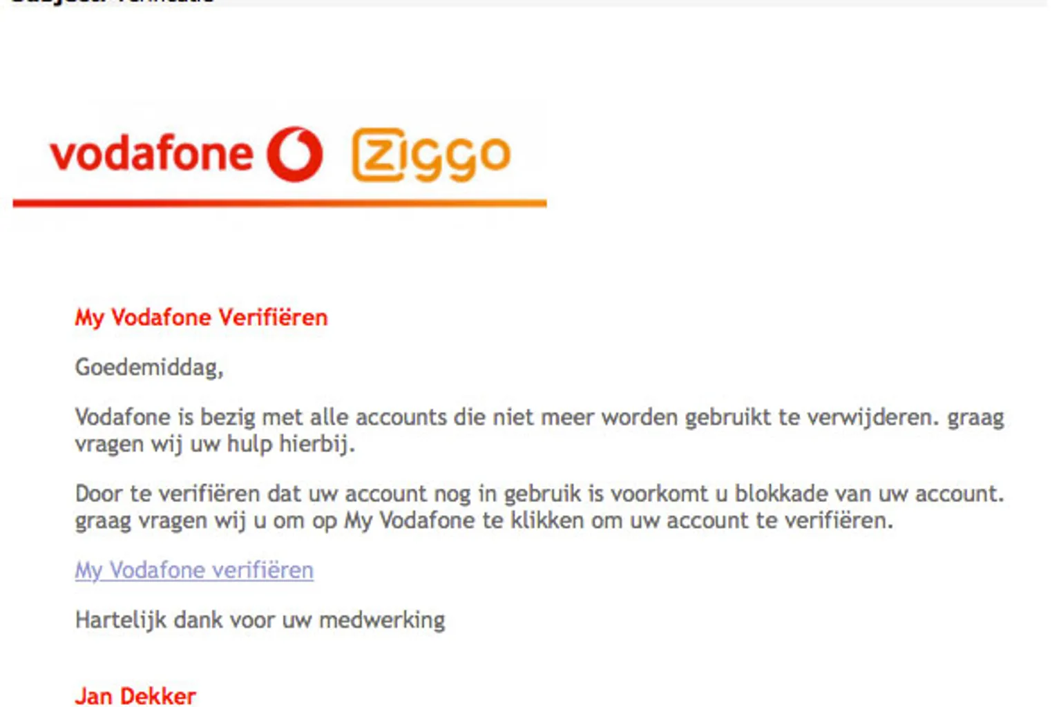 In de e-mail kun je lezen dat Vodafone bezig is met het verwijderen van alle accounts die niet meer worden gebruikt. Daarom dien je je account te verifiëren via een link in het bericht. Doe dit niet! De link stuurt je door naar een valse site waar om onder meer je inloggegevens wordt gevraagd. Let op! Alle gegevens die je invoert op de nepsite zullen in handen van criminelen vallen.