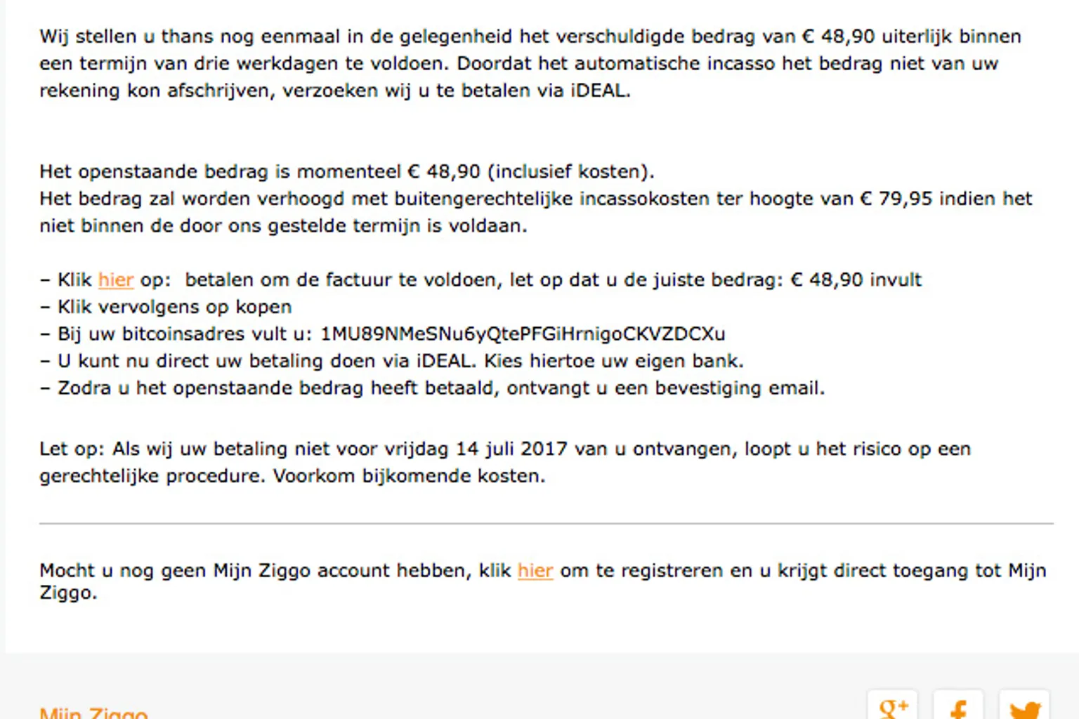 In het bericht vind je een link waarmee je de factuur online kunt voldoen. Deze link verwijst naar een website waar je bitcoins kunt via iDEAL. Als je hierop ingaat, betaal je helemaal geen factuur, maar koop je bitcoins voor de oplichters die deze e-mail hebben verstuurd. Ziggo zal je nooit vragen een rekening via bitcoins te betalen.
