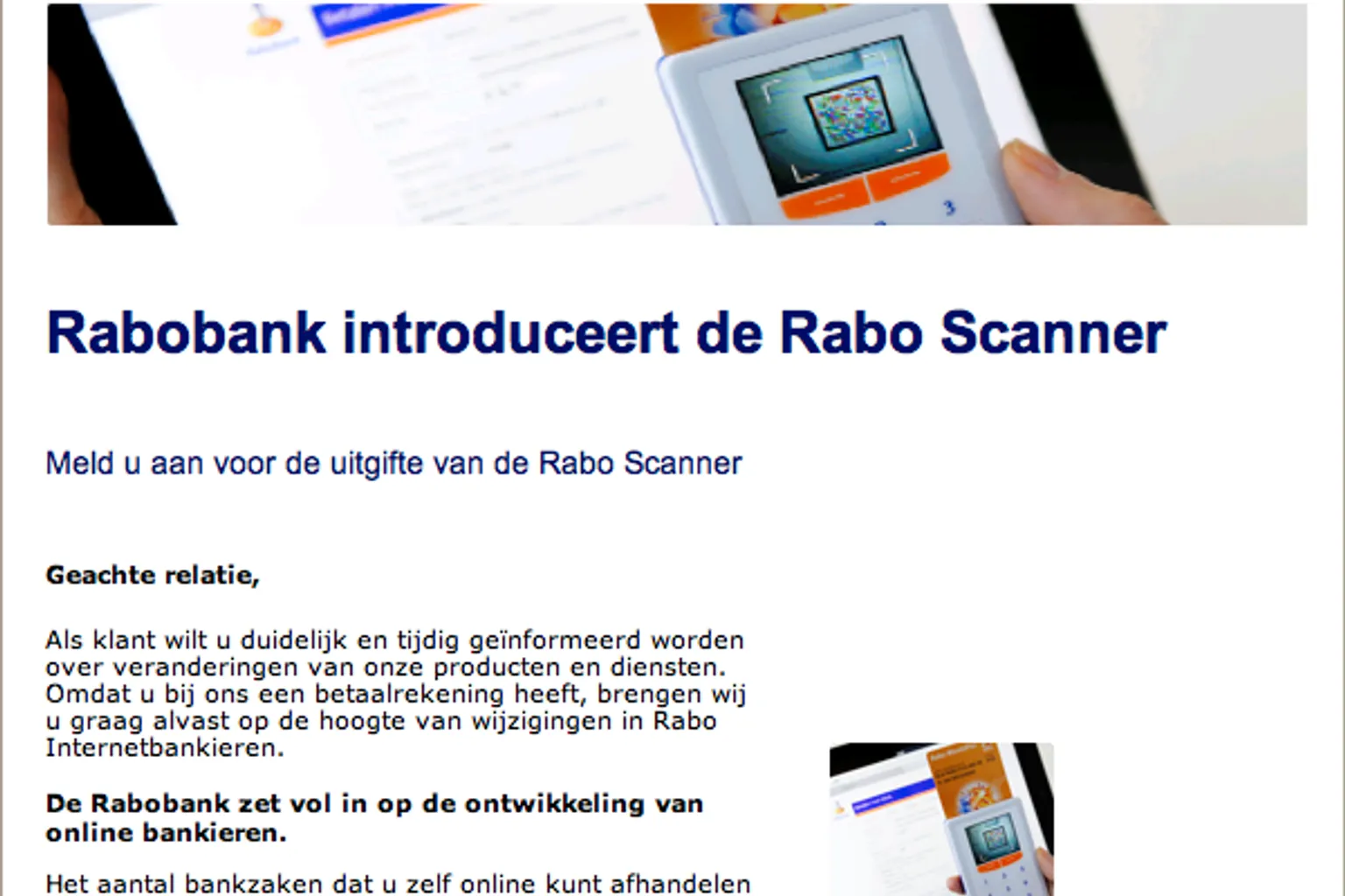 De zender beweert dat alle random-readers van de Rabobank worden vervangen door de Raboscanner. Deze Raboscanner wordt met een volledig nieuwe betaalpas bij je thuis afgeleverd. Het enige wat je hiervoor hoeft te doen, is je account activeren.