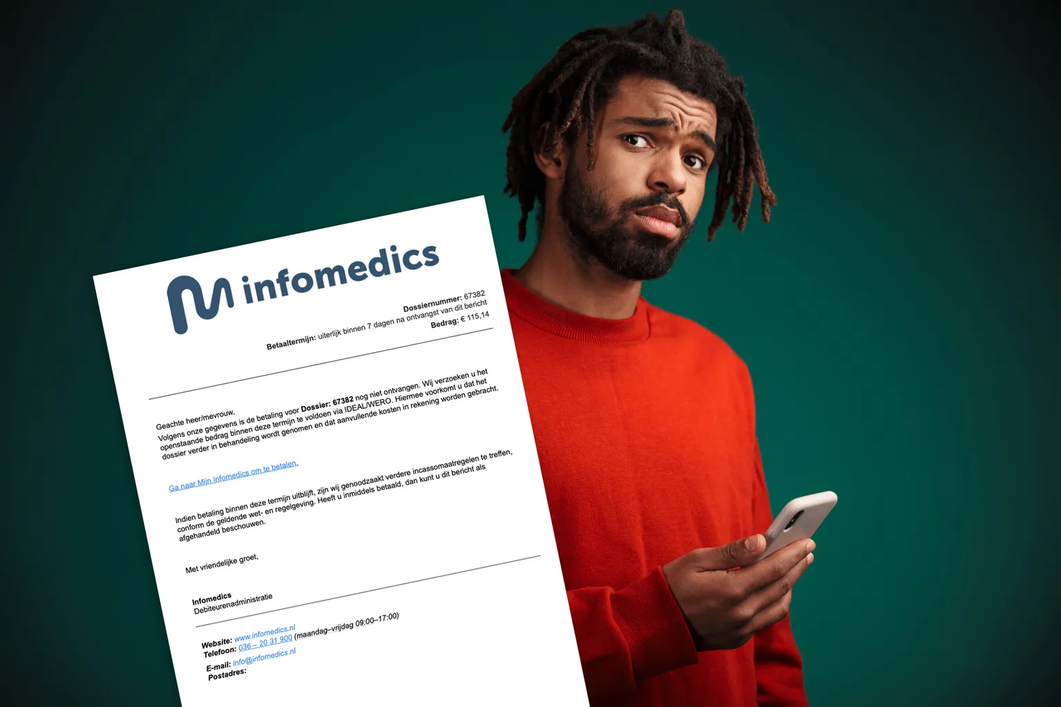 Valse Infomedics-mail over een openstaande rekening van €115,14 met dossiernummer ‘67382’