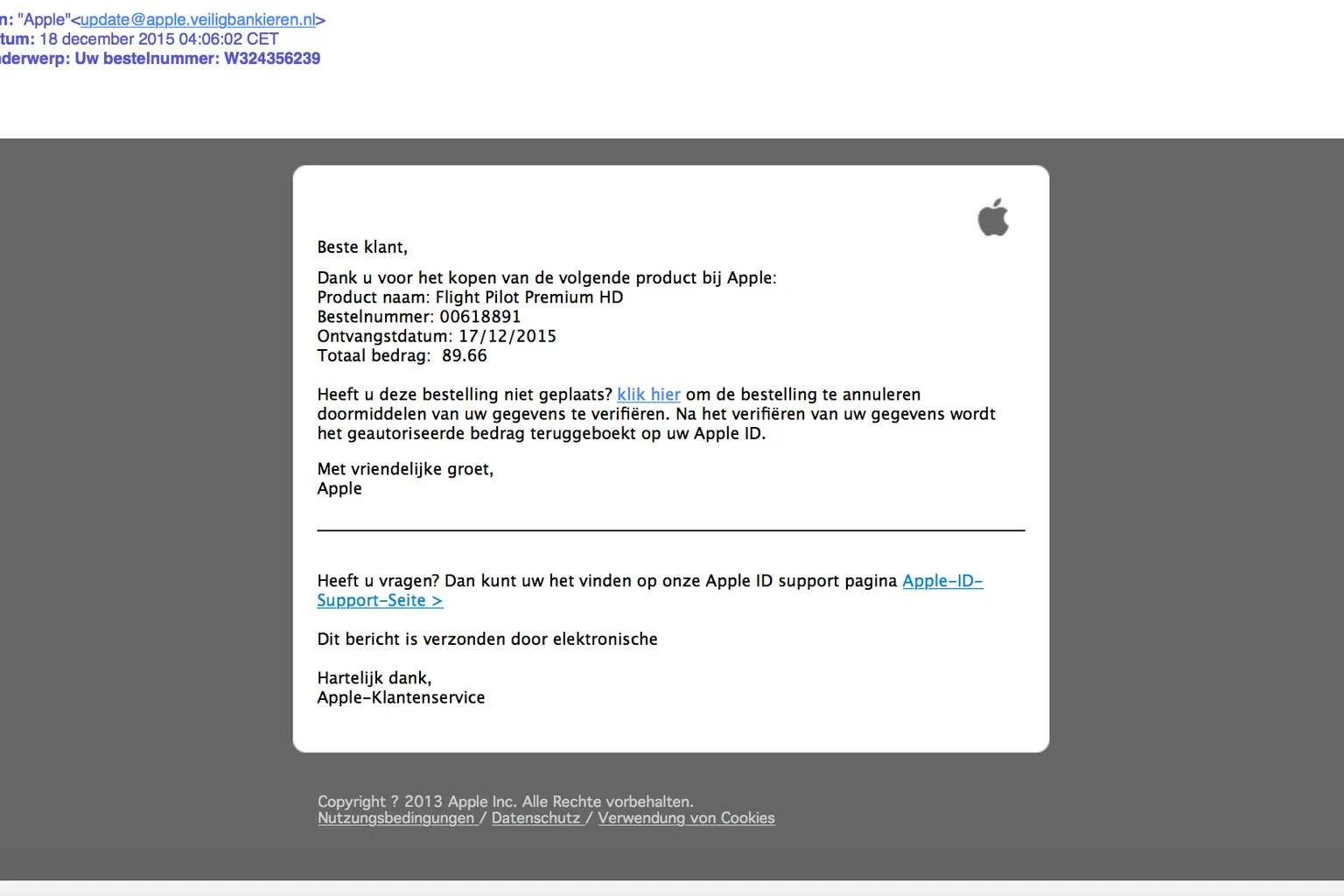 In een valse mail uit naam van Apple staat dat je een bestelling gedaan hebt.