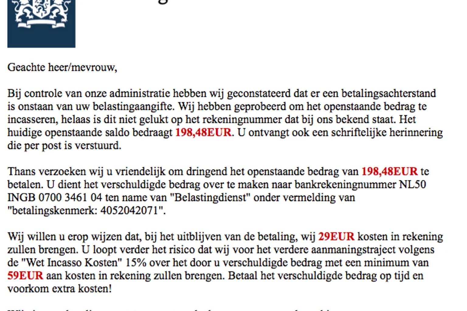 Volgens de mail is heeft de Belastingdienst al een keer geprobeerd het bedrag te incasseren maar is dat tot op heden niet gelukt. De betalingsachterstand zou zijn ontstaan uit de belastingaangifte. Mocht er niet betaald worden, zal het bedrag verhoogd worden.