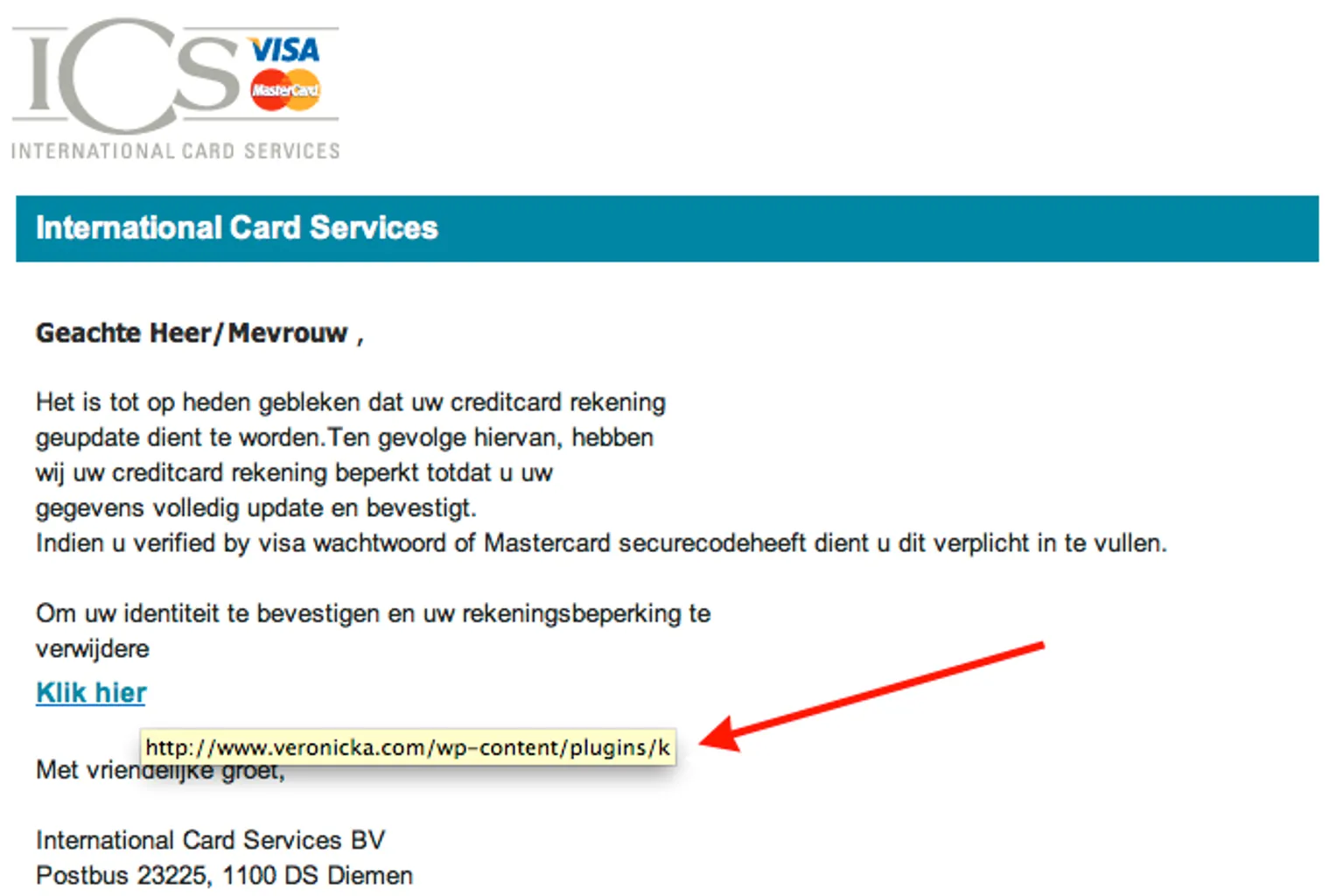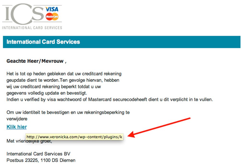 - De link in de e-mail verwijst naar een andere website dan https://www.icscards.nl. Dit ziet u als u met de cursor van de muis op de link gaat staan, zonder deze daadwerkelijk aan te klikken.