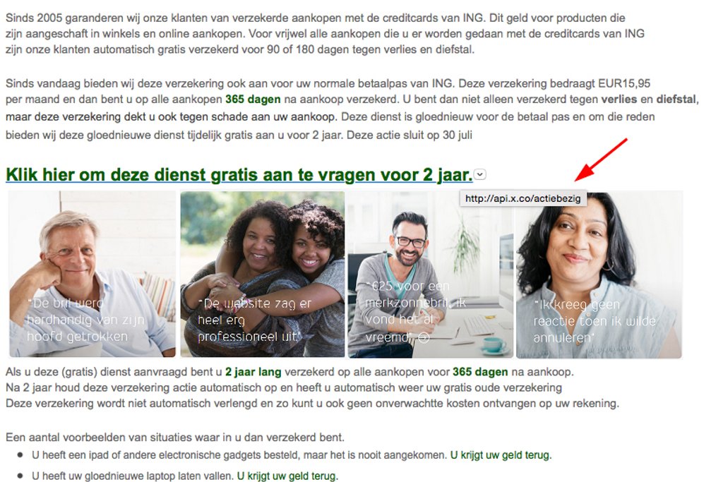 In het bericht staat dat het nu mogelijk is een verzekering af te sluiten, waarmee alle aankopen met je ING bankpas 365 dagen verzekerd zijn tegen verlies, diefstal en schade. Normaal gesproken zou deze verzekering 15,95 euro per maand kosten, maar wie deze maand nog registreert krijgt de verzekering twee jaar gratis. Ga hier niet op in!Deze mail is niet verstuurd door ING, maar door oplichters die uit zijn op je bankgegevens. Als je op de link klikt, kom je terecht op een valse ING-site, waar naar je inlog- en persoongegevens wordt gevraagd.